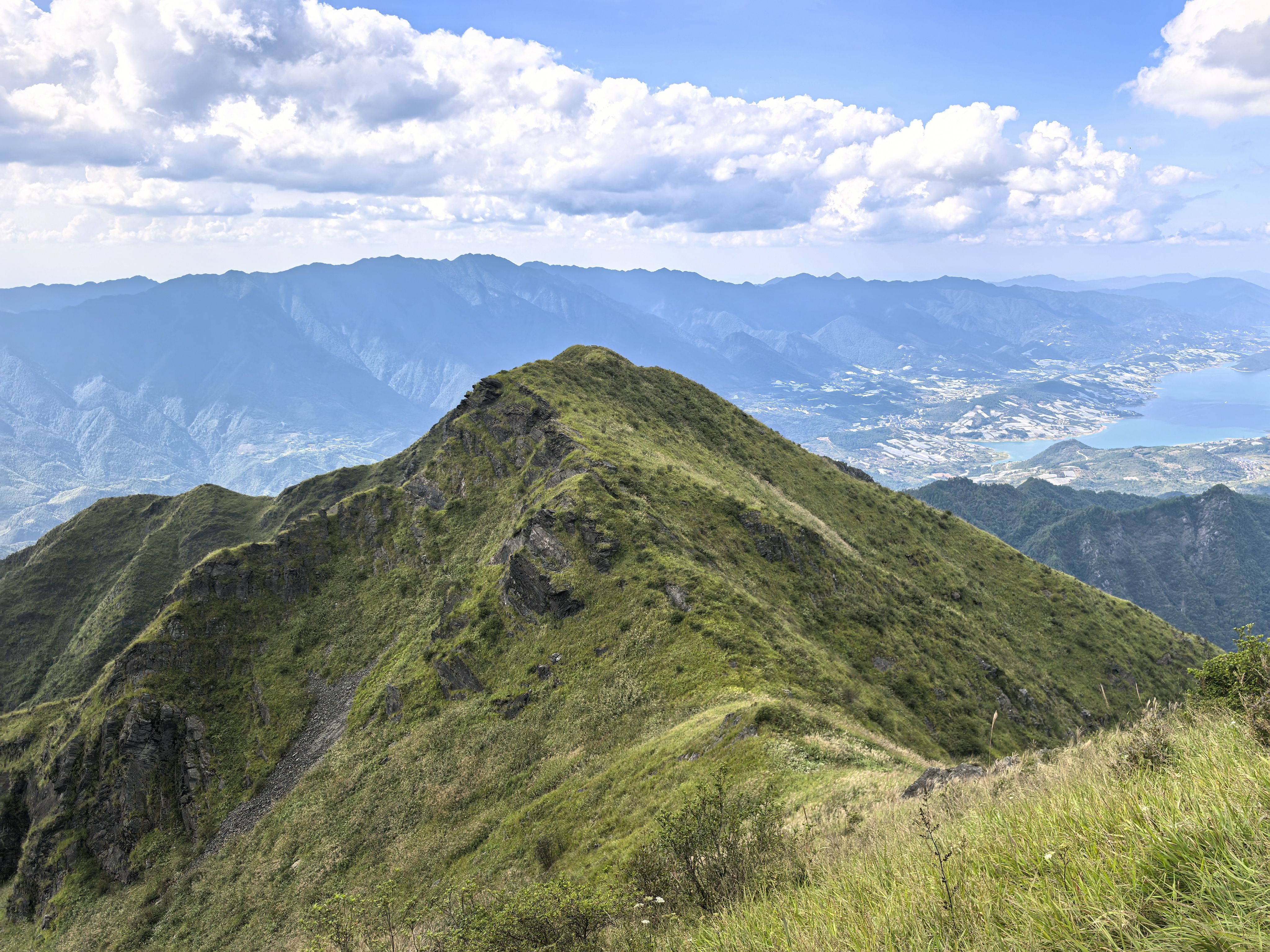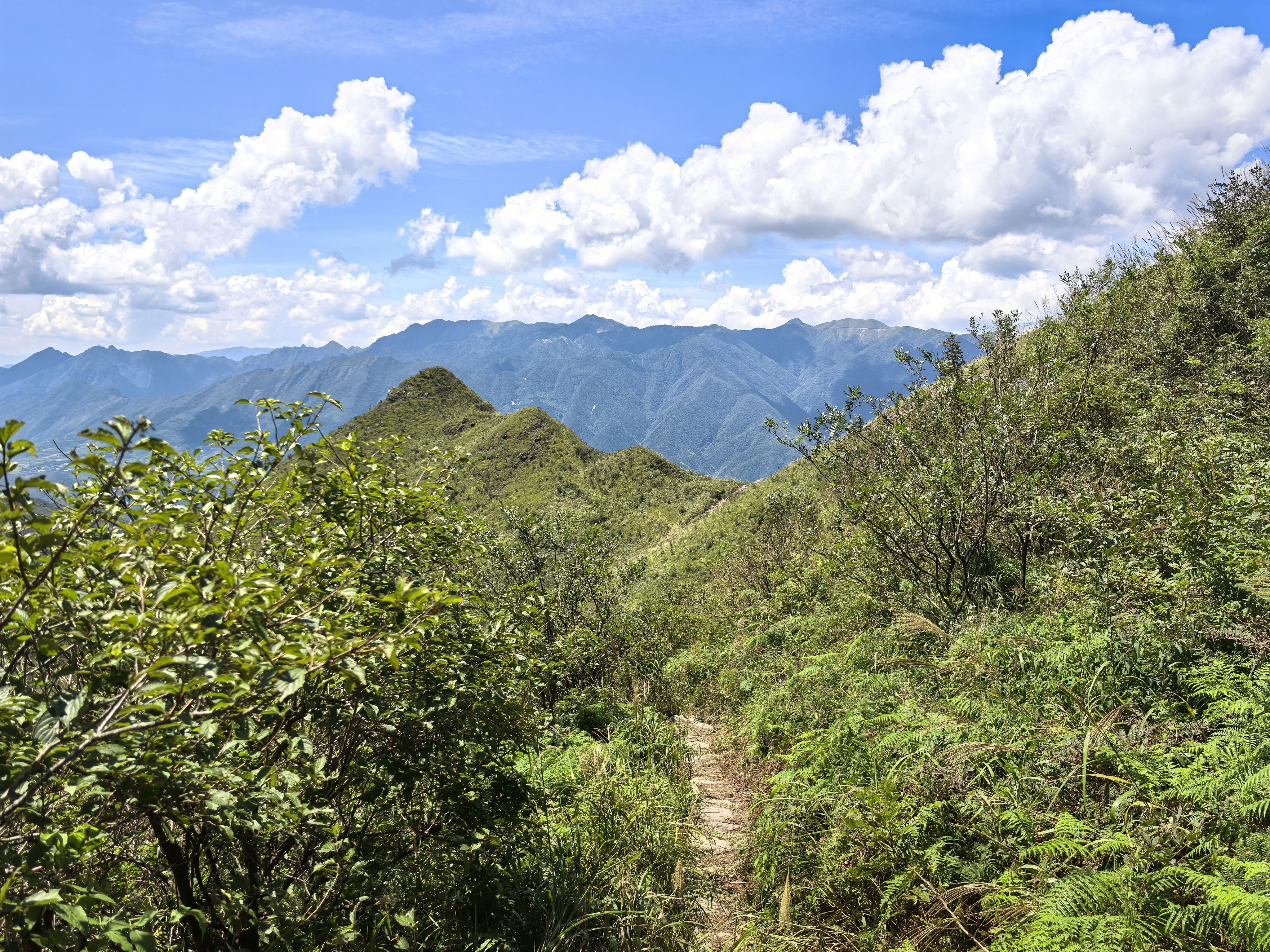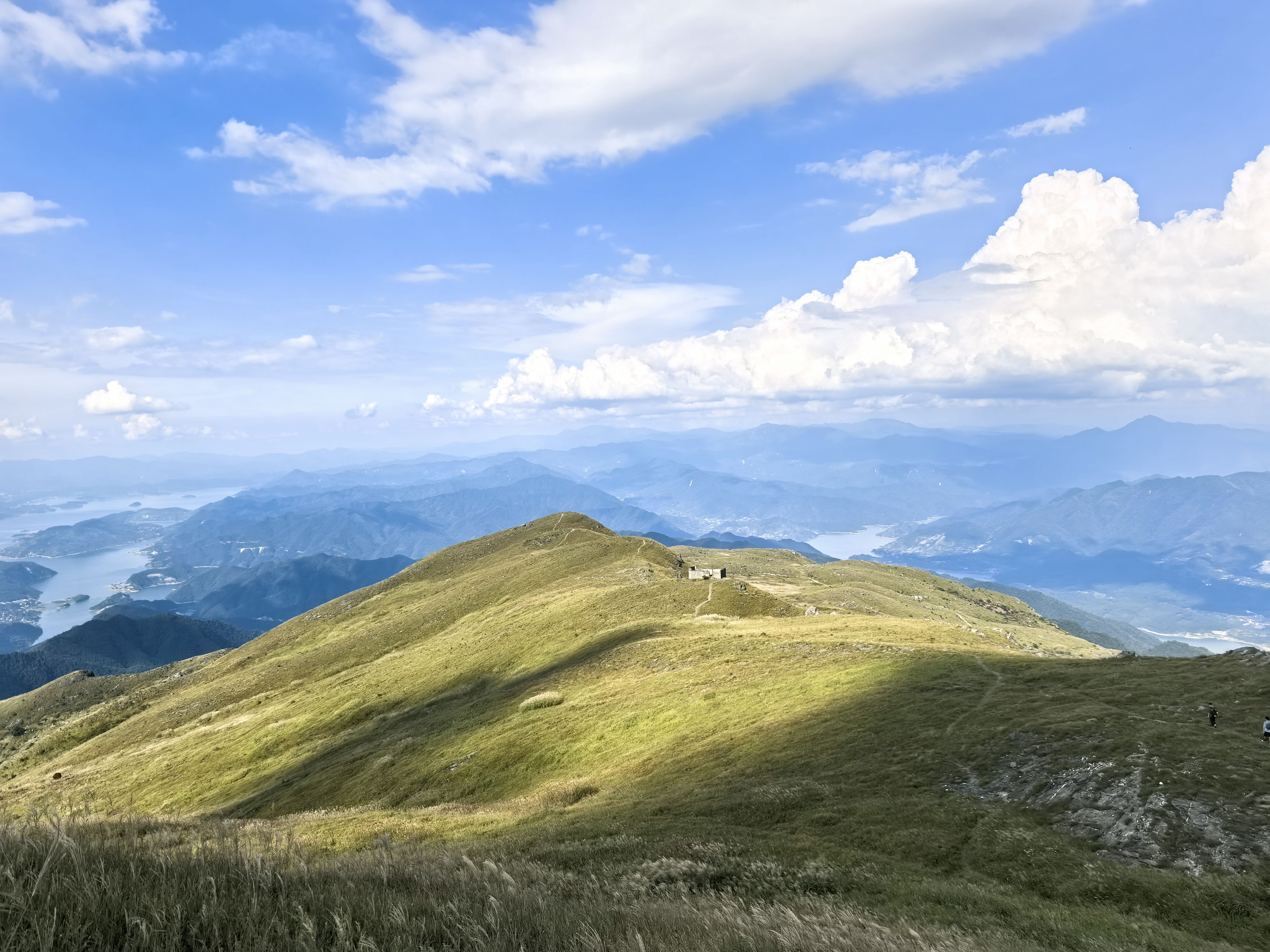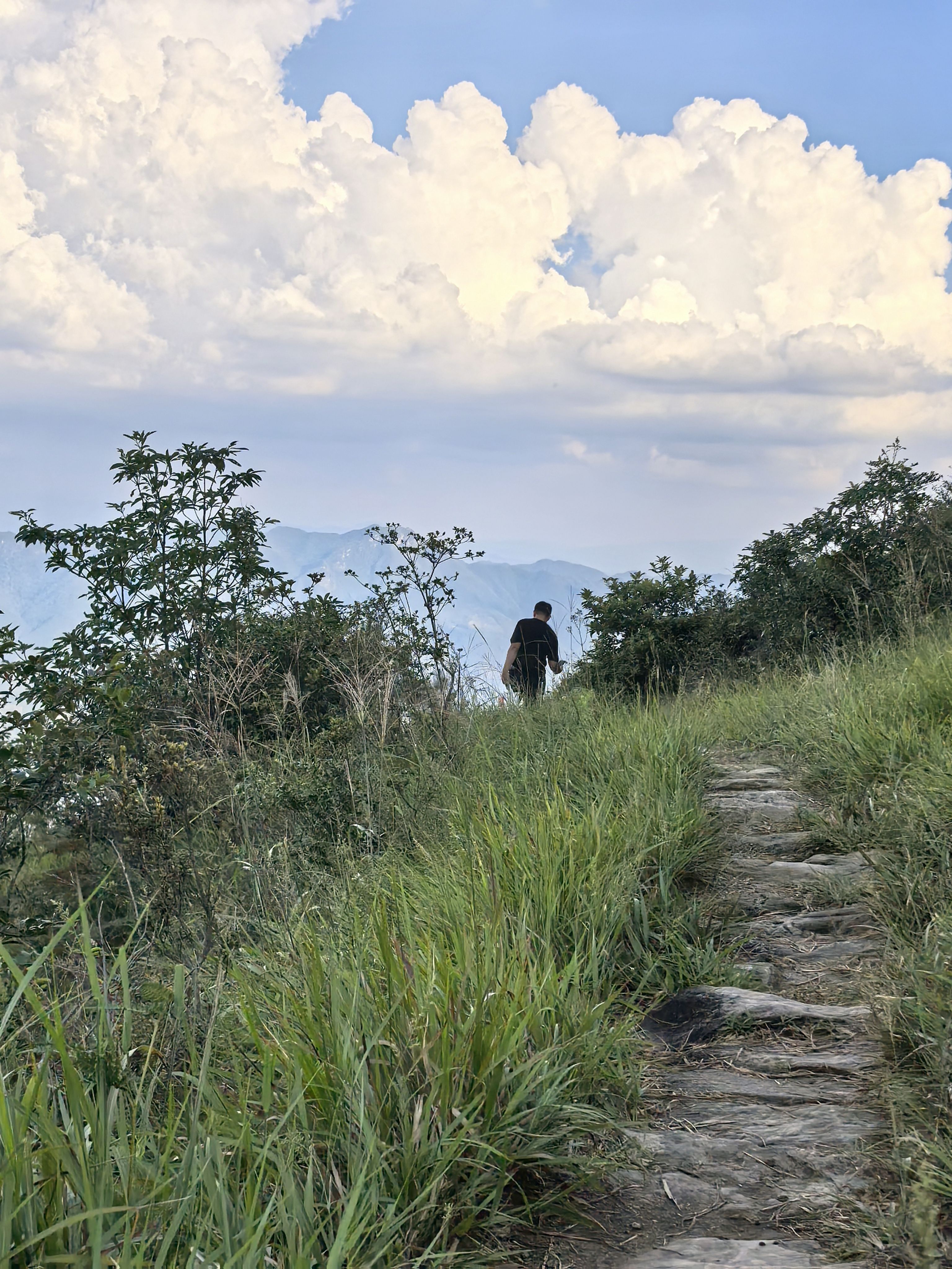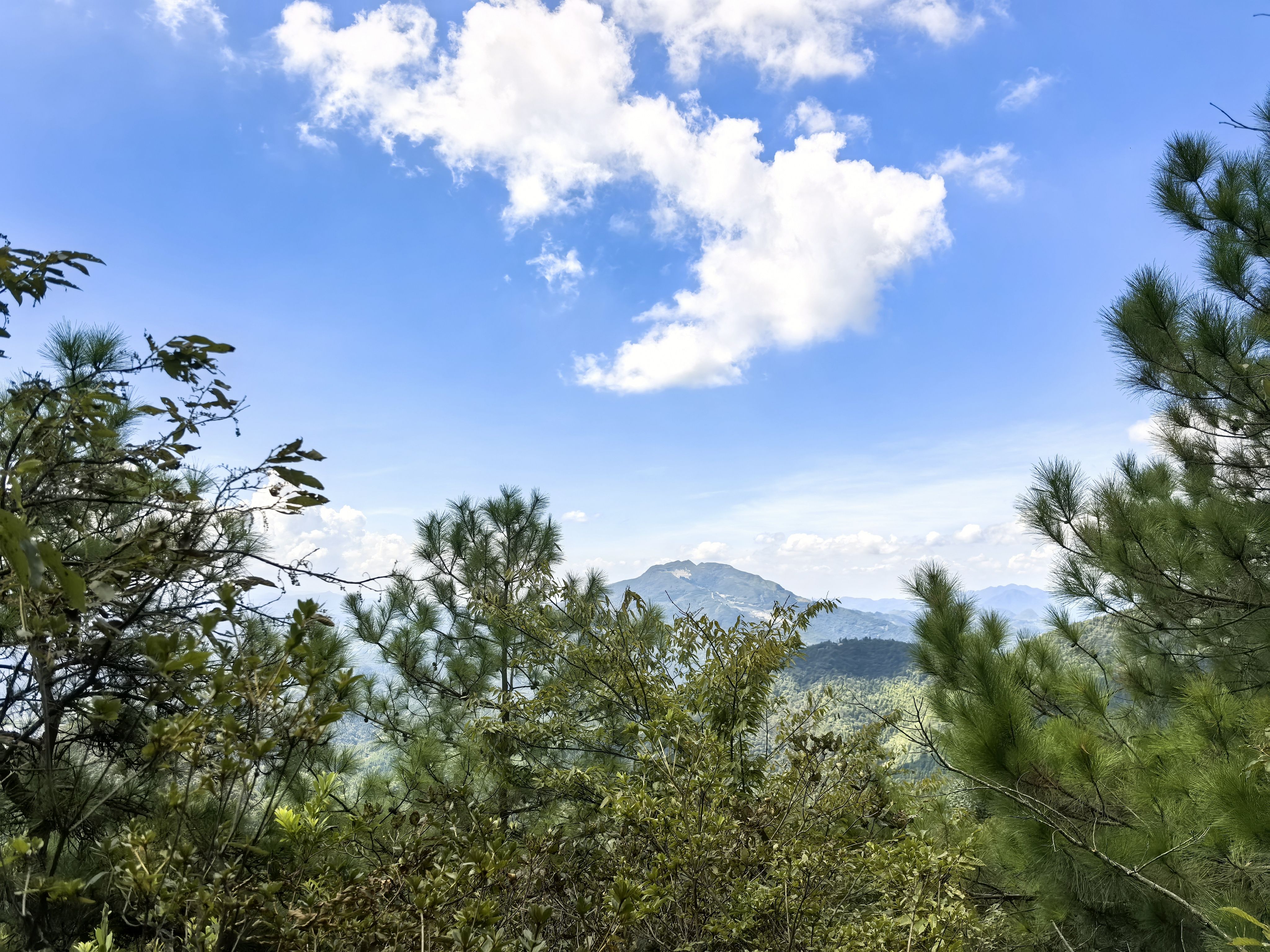 途中,我们遇到几位贵州来的重装驴友,他们应是打算在山顶露宿看日出拍照。爬山起初很累,适应节奏后会轻松些。默言年纪最大,爬这种难度的山有些吃力,大家都按自己的节奏前进。越往上,海拔越高,透过灌木看到山峰和蓝天,让人满怀期待。走到山脊,被披着黄色外衣的大山美景折服,远处山峦起伏,蓝天白云相得益彰,驴友负重前行的队伍也是一道风景。拍照打卡,留下最美瞬间,是户外人的选择。闲暇时翻翻相册,便是最美的回忆。