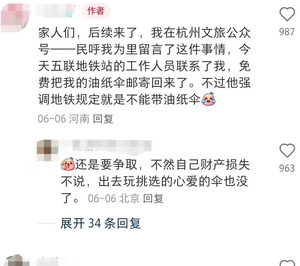 没想到投诉发出去没几天,李女士就接到了地铁工作人员的电话。对方语气很客气,说他们看到了投诉,非常理解她的心情,愿意免费把油纸伞邮寄到她家。李女士当时都愣住了,没想到还有这种操作,心里的怨气瞬间消散了不少。