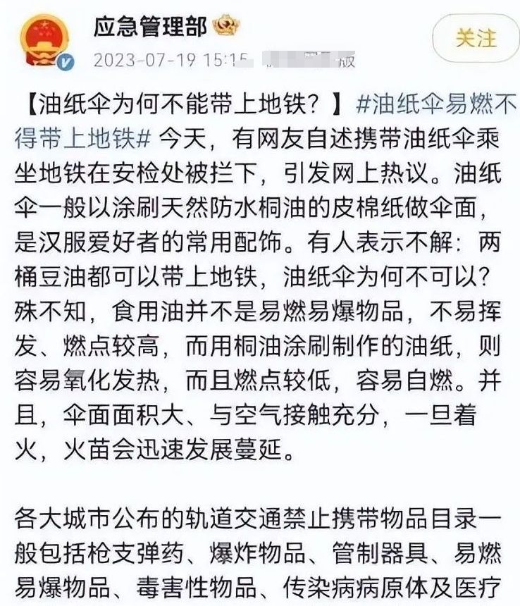 李丽琴女士称:在杭州游玩时,看上一把油纸伞,想着带回家当纪念品。结果乘地铁时被安检员拦下了,说油纸伞是易燃品,不能带。李女士没办法,只能把伞留下。网友:有人支持安检,觉得安全第一;有人觉得规定太死板,油纸伞又不是啥危险东西。没想到,几天后地铁站主动联系李女士,免费把伞寄回去了,但还强调规定没变。油纸伞涂了桐油,容易自燃,好多地方地铁都不让带。