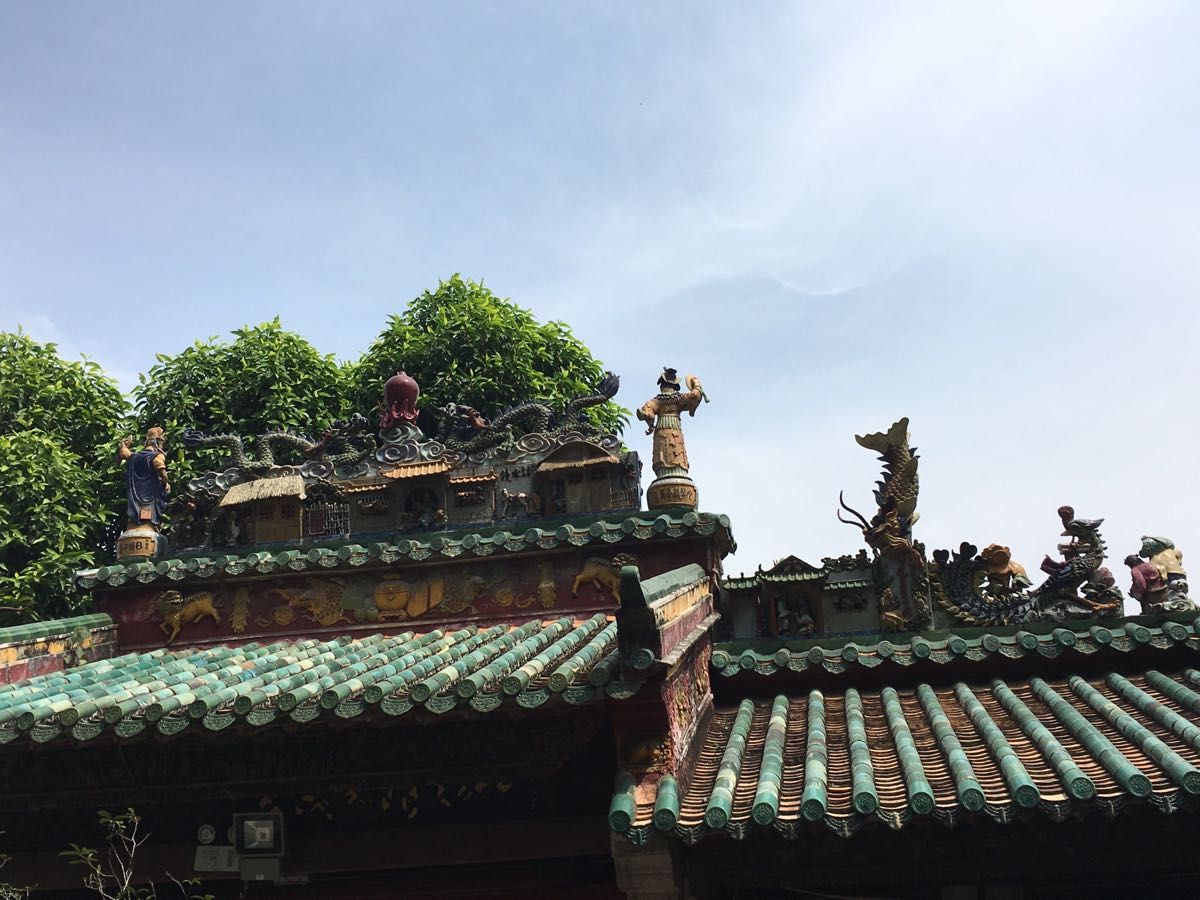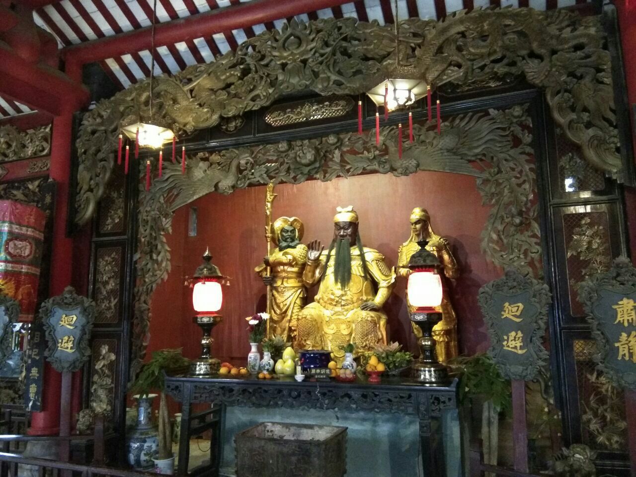 听庙里的老义工说,最初建庙花了二十多年,后来岁月里几经修缮,最近一次大规模重建是 1985 年。好在重建时没丢了老底子,四合院式的布局保留得完整:从山门进去,穿过栽着几株老榕树的天井,就是前殿,殿内梁上还留着当年的木雕,虽有些地方被岁月磨得光滑,可龙凤、花鸟的纹路依旧清晰;再往里走是正殿,正中的关公像端坐着,红脸长髯,一身绿袍,眼神威严却不凶悍,像在静静守护着一方百姓。两侧的偏殿里,还摆着些老顺德的民俗展品,有旧时的粤剧戏服,也有祭祀用的铜器,逛着逛着,就像走进了顺德的老时光里。