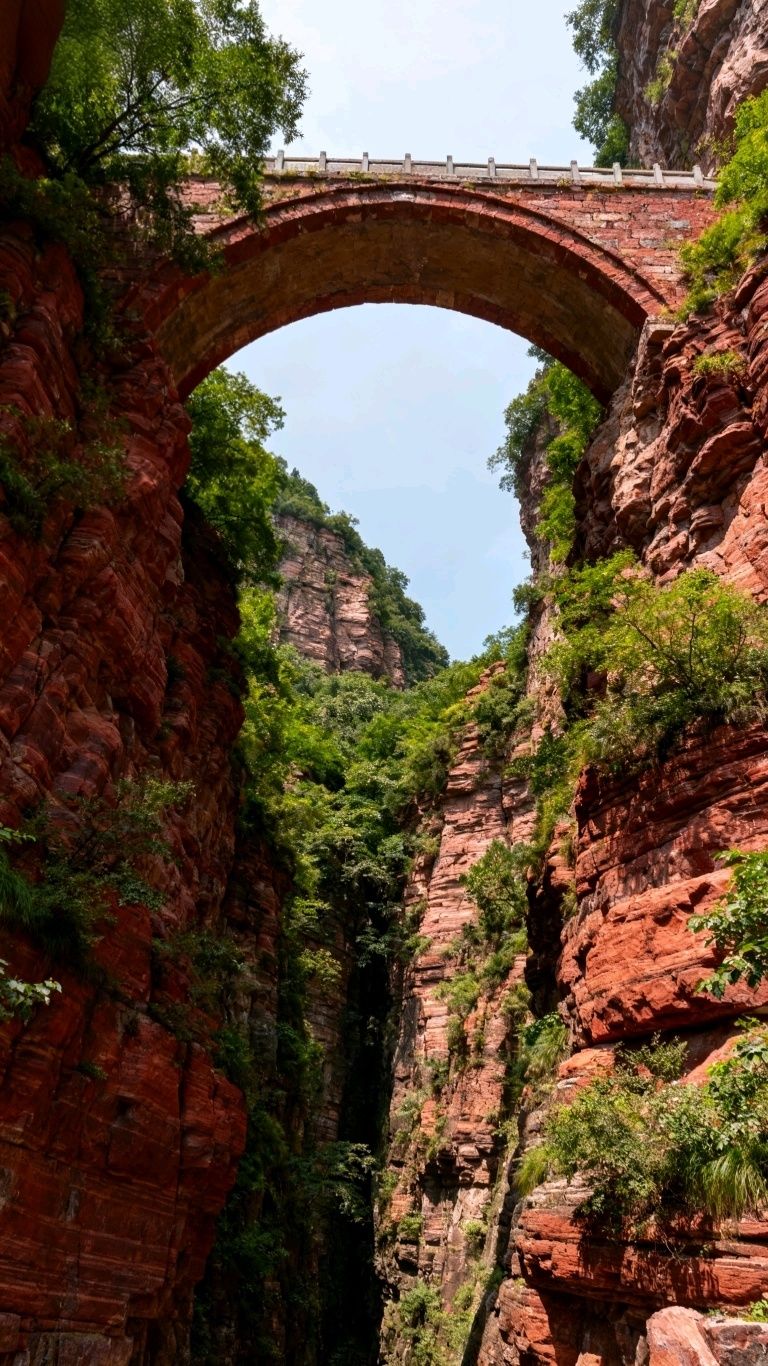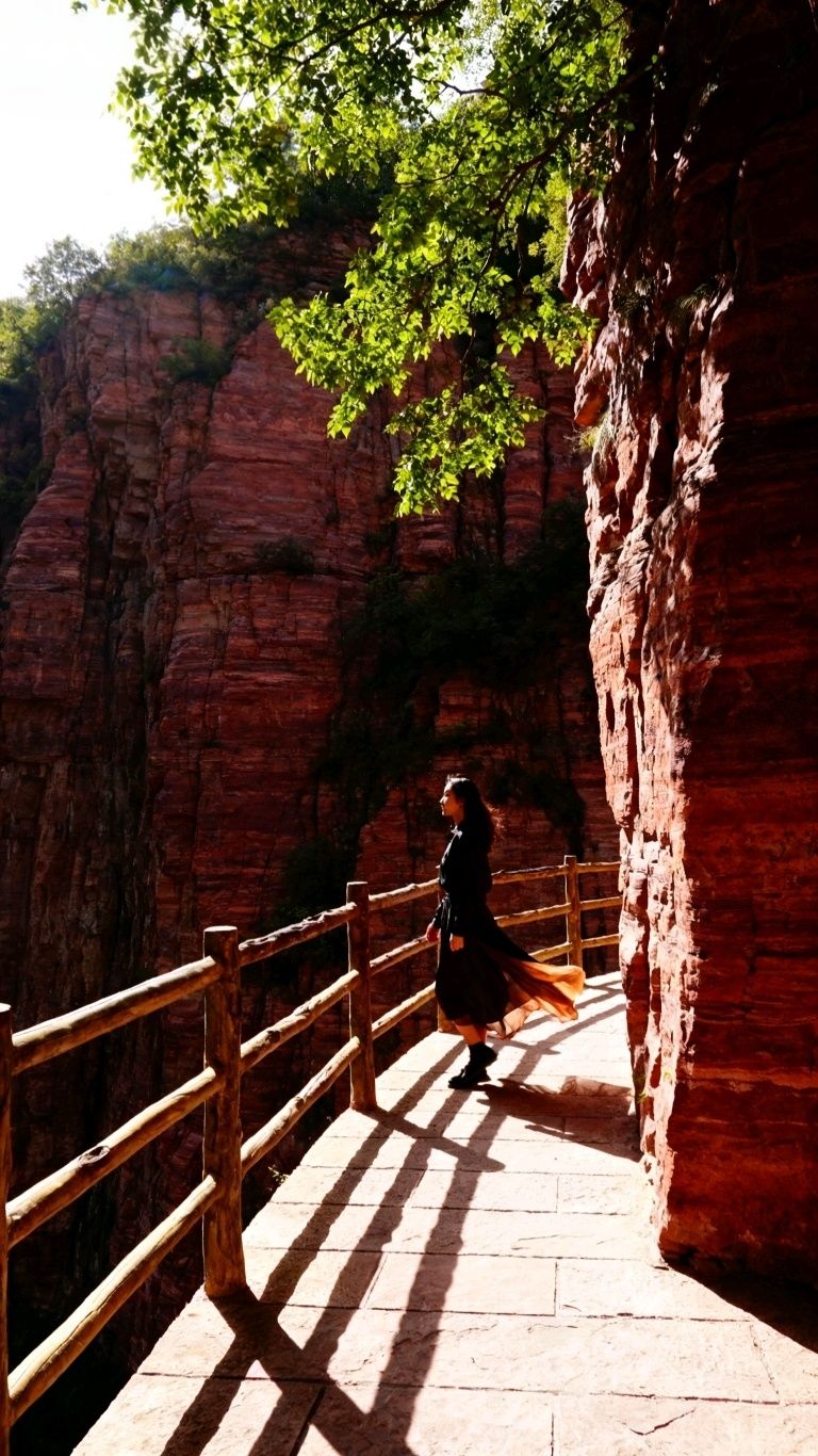 最绝的是那座石拱桥,横跨在两山之间,像道古老的眉眼。我撑着伞站在桥洞下,看阳光从岩缝里漏下来,把水面切成碎金,红岩的倒影在水里晃啊晃,恍惚间竟分不清是山在动,还是水在流。有瞬间觉得,这丹分沟哪是沟,分明是太行把自己的“山海梦”,偷偷藏在了这一方天地里。