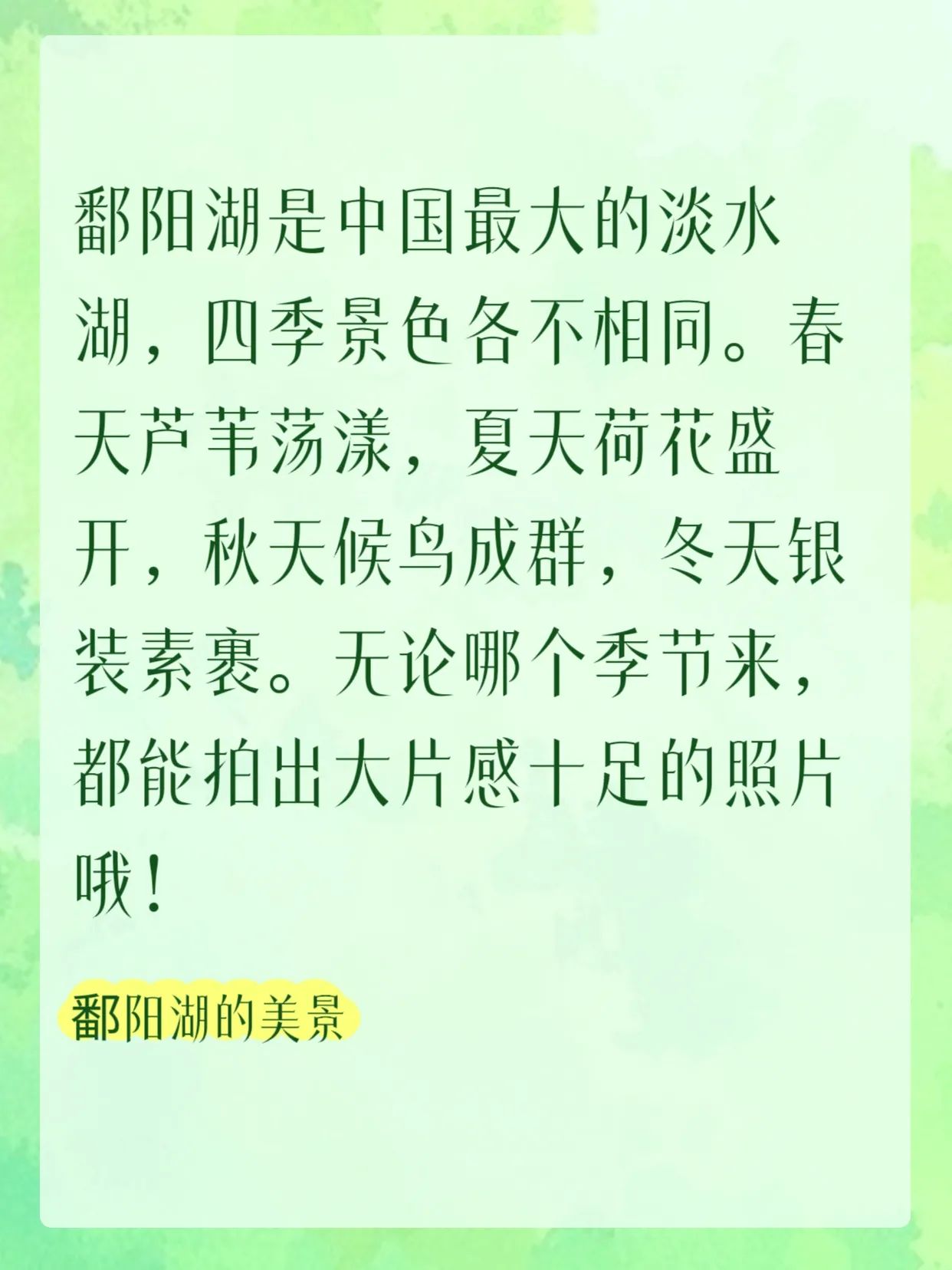 此外,鄱阳湖还有“四季时鱼”(春鲇、夏鲤、秋鳜、冬鳊)和“鄱阳三鲜”(银鱼、鳗鲡鱼、凤尾鱼)。