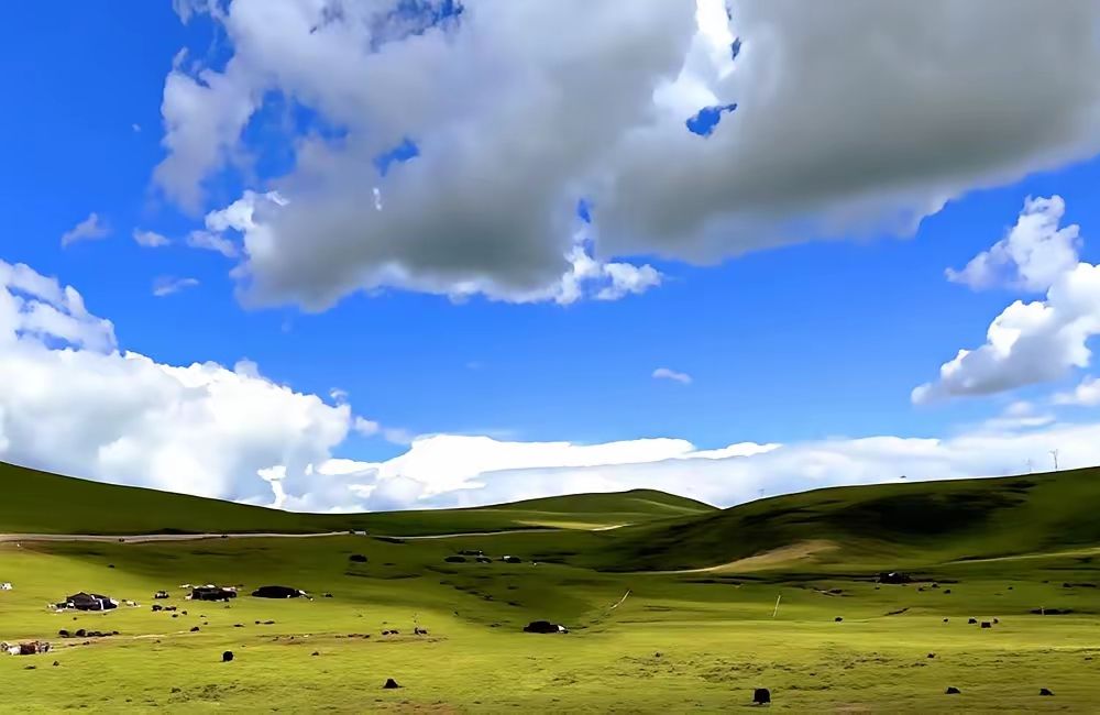 经过拉龙措后,盛大的草原风光迎面而来,绿色的草原曲线起伏,层层叠叠,像波浪荡漾开去,一望无边,天接地连,人、车、蓝天白云、草原紧紧地融为一体。