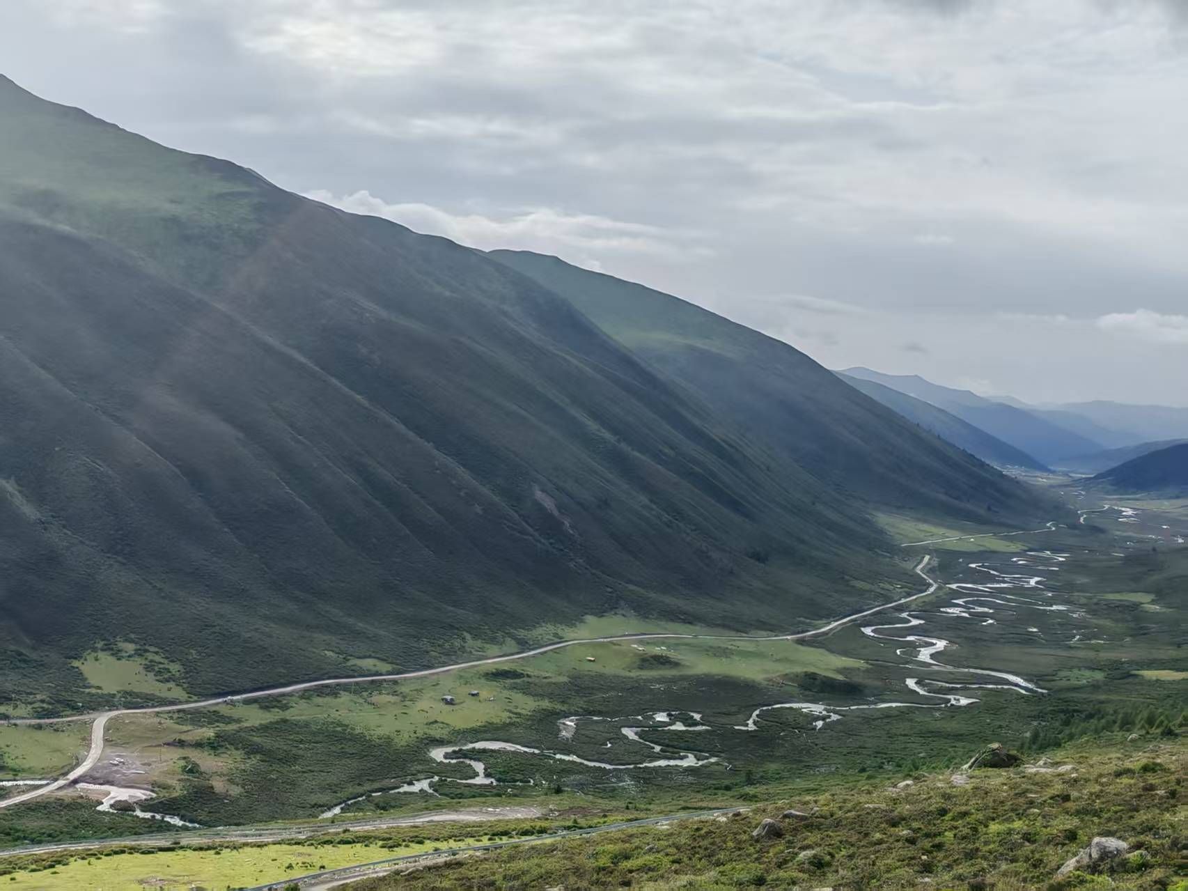 出了隧道,没有一丝云雾,视野豁然开阔。在海拔4600米垭口观景点停息,手机一查,才知我们走过这段险峻陡峭的山叫卓达拉山,冰川遗迹与雪山景观交相辉映,以嶙峋裸露的岩石地貌著称,是近几年甘白线上的打卡热门,被称为 是“魔兽时代”的远古世界。稀里糊涂地走过后,便进入了有高原古冰川地质遗迹的“活态博物馆”。
