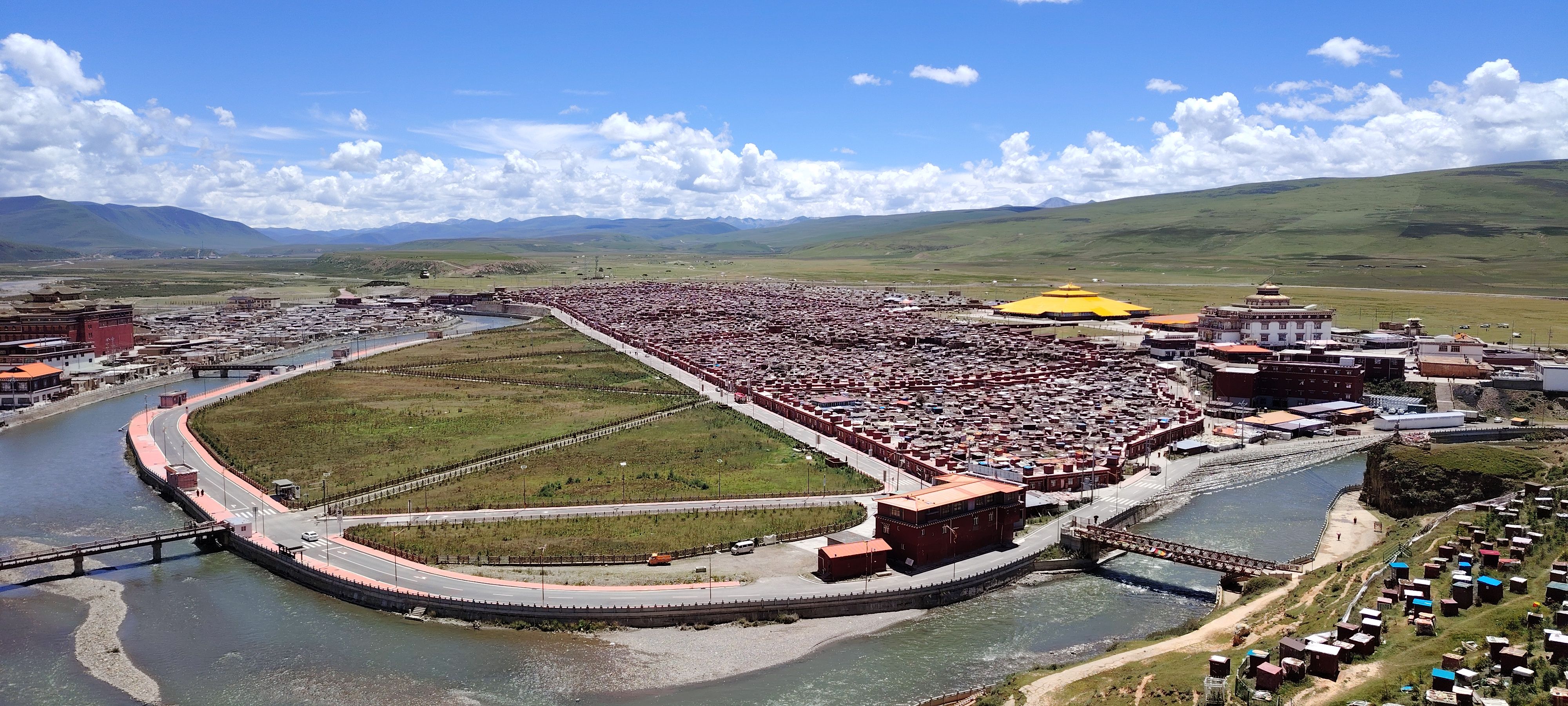 海拔约4000米亚青寺,与同为藏传佛教宁玛派的色达五明佛学院相距约280公里 。地处昌台大草原的盆地,地势开阔平坦。盆地边沿是因寺而兴的集镇,给游人提供吃住、购物等服务。盆地中心,一条大河像玉带一样围护着一个独立的岛屿,这就是觉姆岛,修行的女子全部居住于此,周边无数条小溪纵横,与草地共生成高原湿地。湿地边还有一些因陋就简的棚子,据说也是修行的处所。(待读)