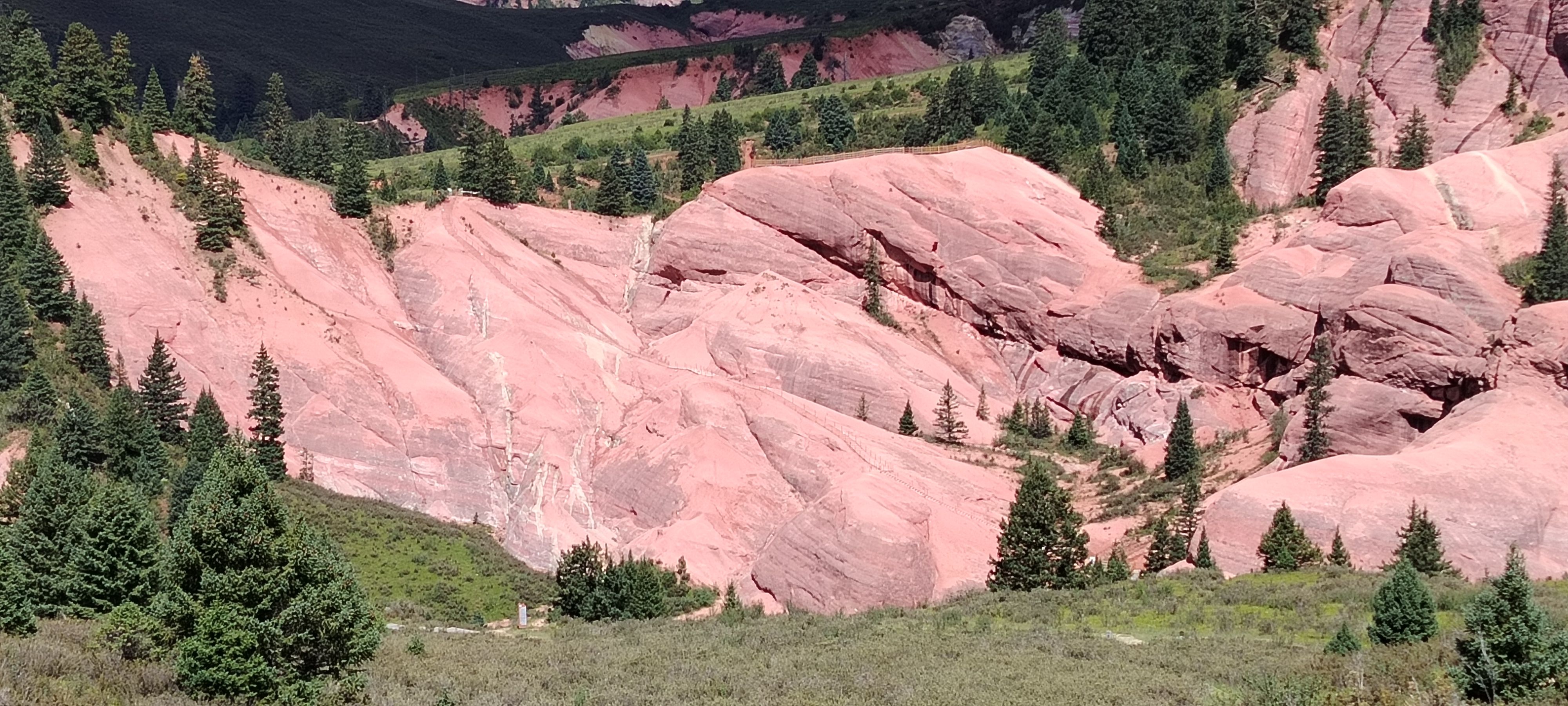 红山位于与甘孜相连的新龙县境内,在海拔4000多米以上,属高原型丹霞地质奇观,我们翻过一个垭口后,就看见左手边红红的山峰,与雪山组合,画面感极强。沿着红山下到低洼的草甸。导航把我们引到游客中心,无人,最后行车2公里到河谷上,才找到新的游客中心。