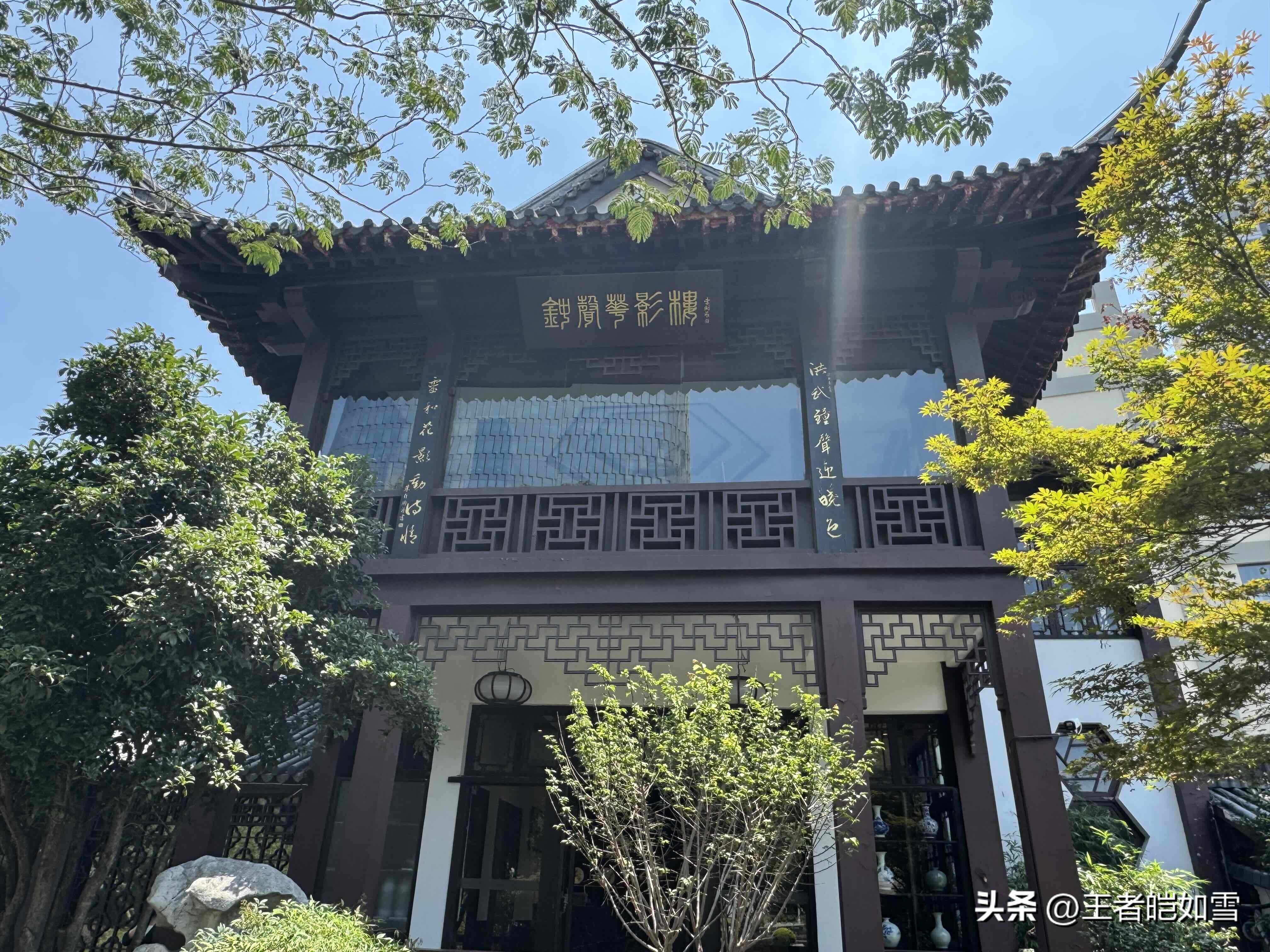 还拍到一座仿古建筑,匾额由“中国水彩画之父”、母校东南大学建筑系教授李剑晨篆书题“钟声花影楼”,有对联一副: