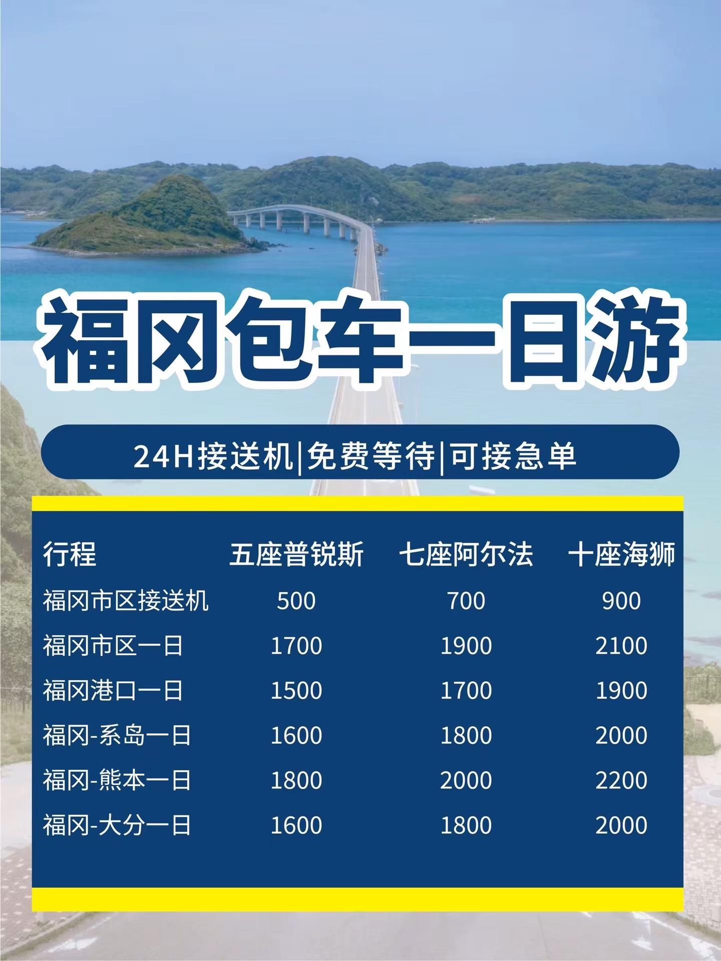 冈包车一日游中文司导+接机价格表已更新宝子们,第一次去福冈旅游想要玩得自由又尽兴,包车绝对是个超棒的选择解放双手-【服务范围】福冈机场接机福冈市区包车福冈周边用车一日游/点对点接送·九州为什么选择包车?九州各景点较分散,包车更方便,体验感舒适可设计专属路线,行程自由专业服务,价格透明,一价全包含,无隐形消费地陪式服务、代订酒店、代订餐·来九州的理由相比东京大阪,九州真的安静质朴许多。这里没有富士山的名气,却有日本著名的温泉。为了美食来一趟:博多拉面、牛肠锅发源地,好吃到哭的甜品店,精致的温泉料理。梦幻童话程度:馒头屋水果站,别样火山体·【九州景点分布】福冈:太宰府、舞鹤公园、博多运河城熊本:熊本部长、熊本城、黑川温泉、阿苏火山、水前寺宫崎:鹈户神宫、高千穗峡、日南太阳花园鹿儿岛:樱岛火山、雾岛牧场、汤之平展望所佐贺:武雄市图书馆、武雄神社、慧洲园、御船山乐园长崎:大浦天主教堂、稻佐山夜景、九十九岛、豪斯登堡大分:由布岳、金鳞湖、九重梦大桥、别府地狱温泉·【九州一日行程】福冈线:福冈港口-太宰府天满宫-博多运河城-天神区-福冈塔-返回港口线:福冈港口-南藏院-太宰府天满宫-大濠公园-天神区-返回港口-熊本线:熊本港口-熊本城-水前寺成趣园-熊本熊部长办公室-返回港口线:熊本港口-阿苏火山-草千里-白川水源-返回港口#今日份心情预报 #日本自由行 #日本交通