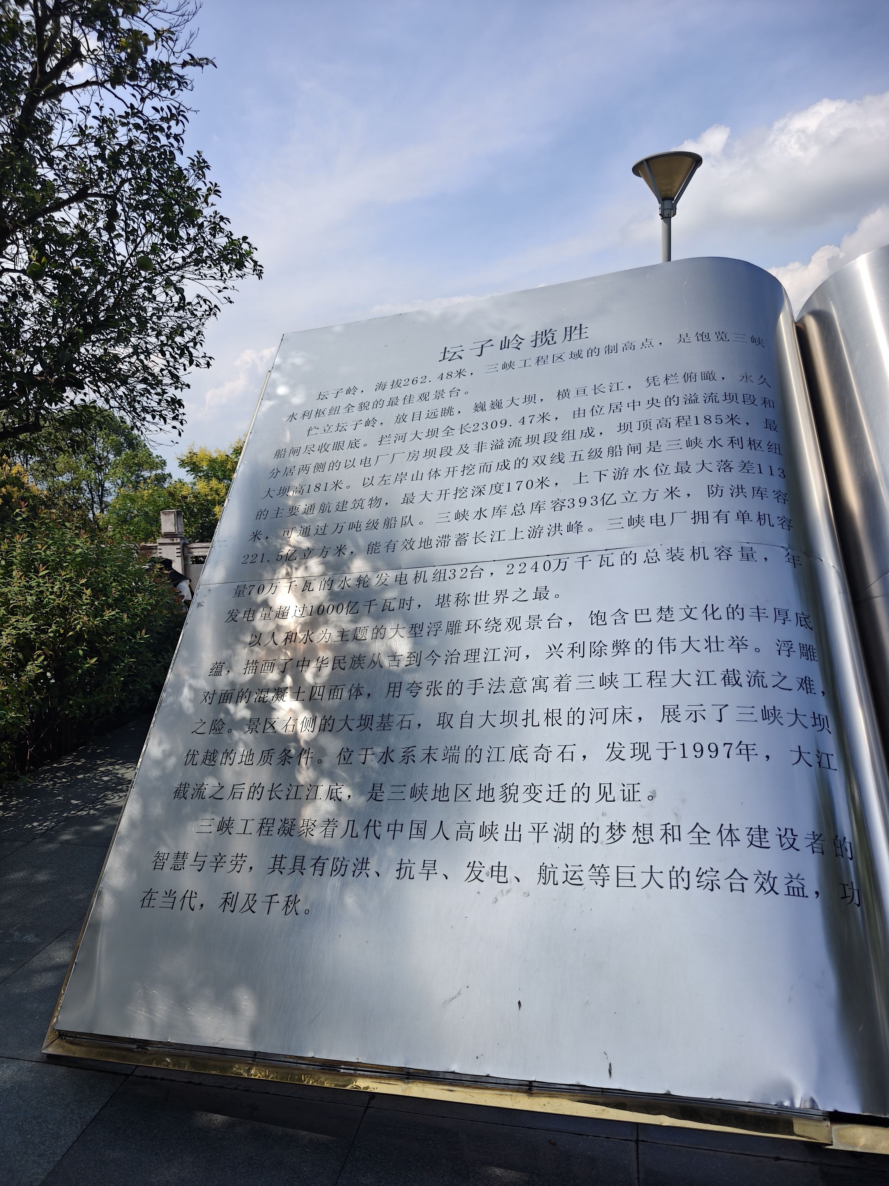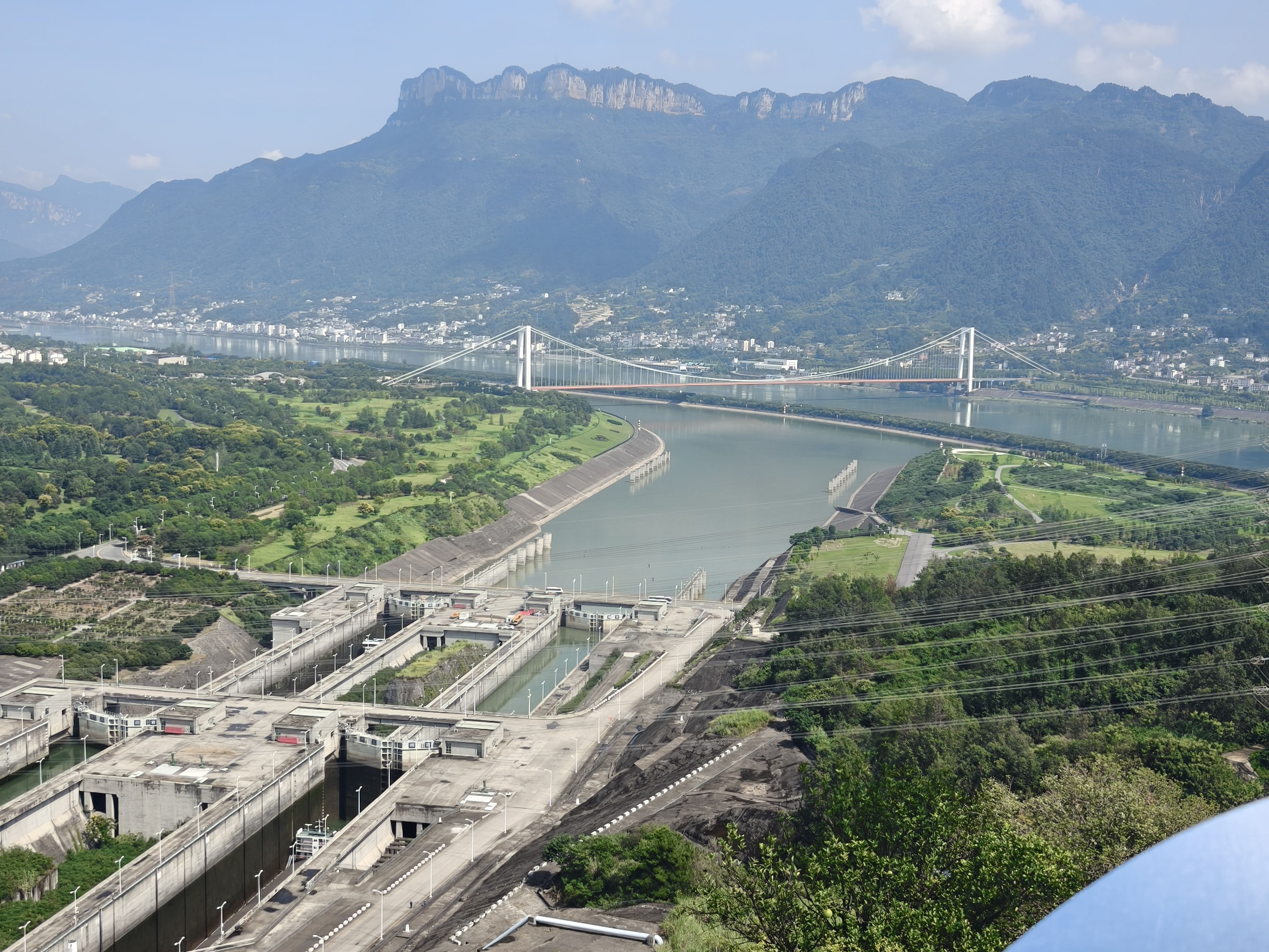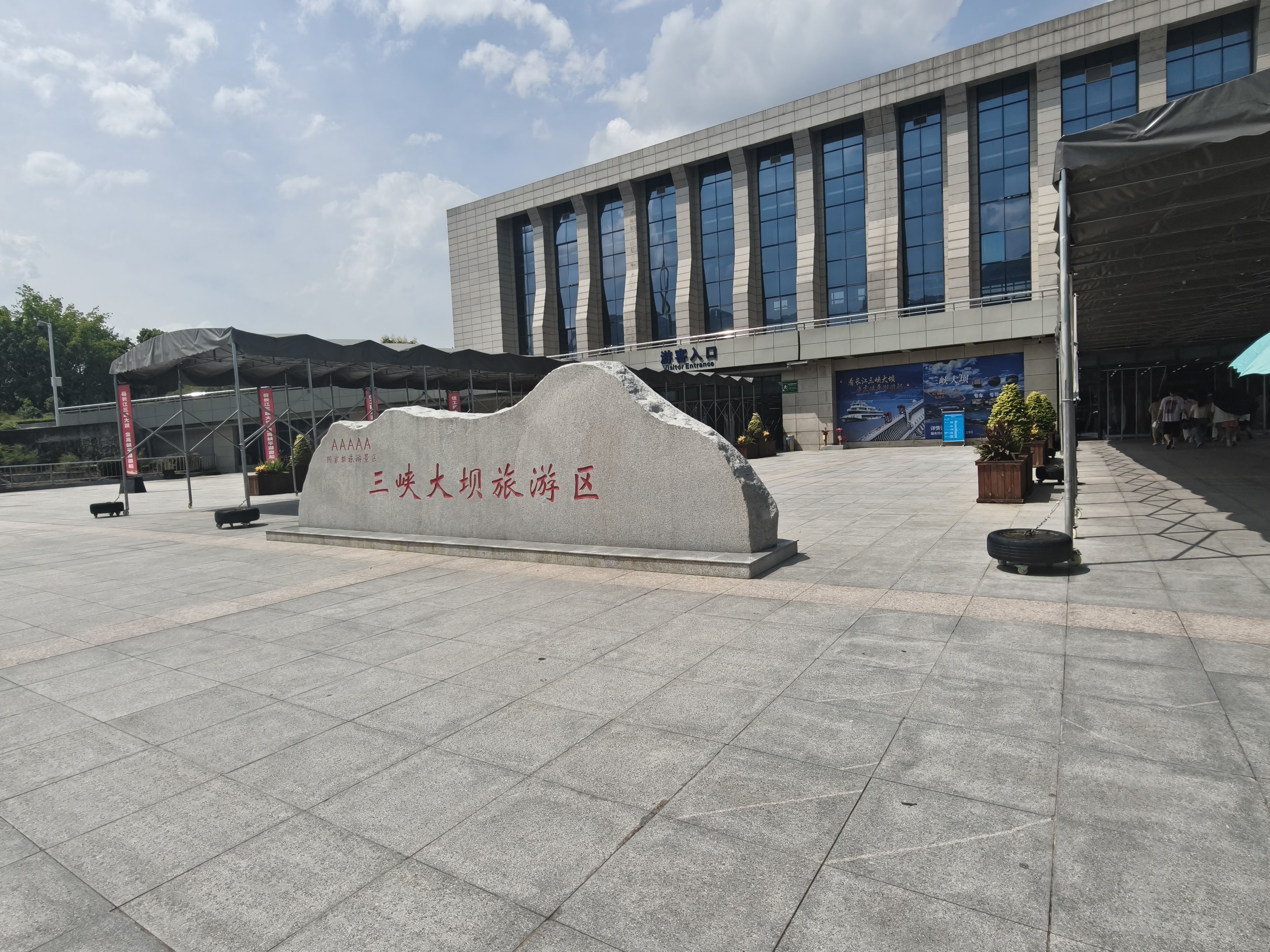 中午游船旅程结束下船,吃了自助餐以后,上车正式开始三峡大坝之旅。今天本来天气预报是阴有中雨,结果就早上阴了一会儿,之后就阳光明媚,蓝天白云。太阳晒在皮肤上火辣辣的,清晰感受到了阳光的压力。今天感受到了秋老虎的厉害,汗出了一身有一身。还好有些内容是博物馆里,体验馆里,相对舒服很多。还是有不少人完成不了游览路线,受不住天气的炎热。