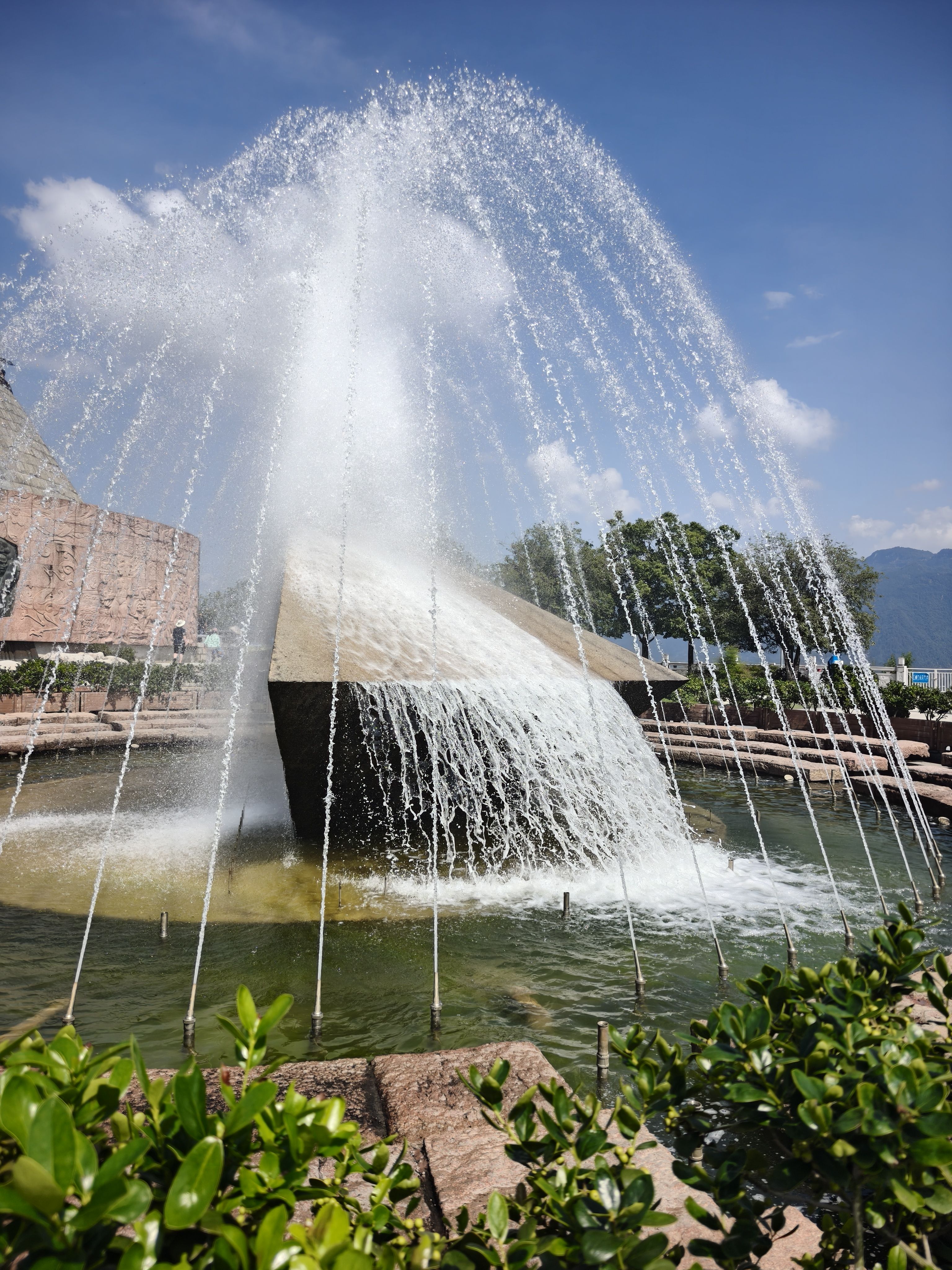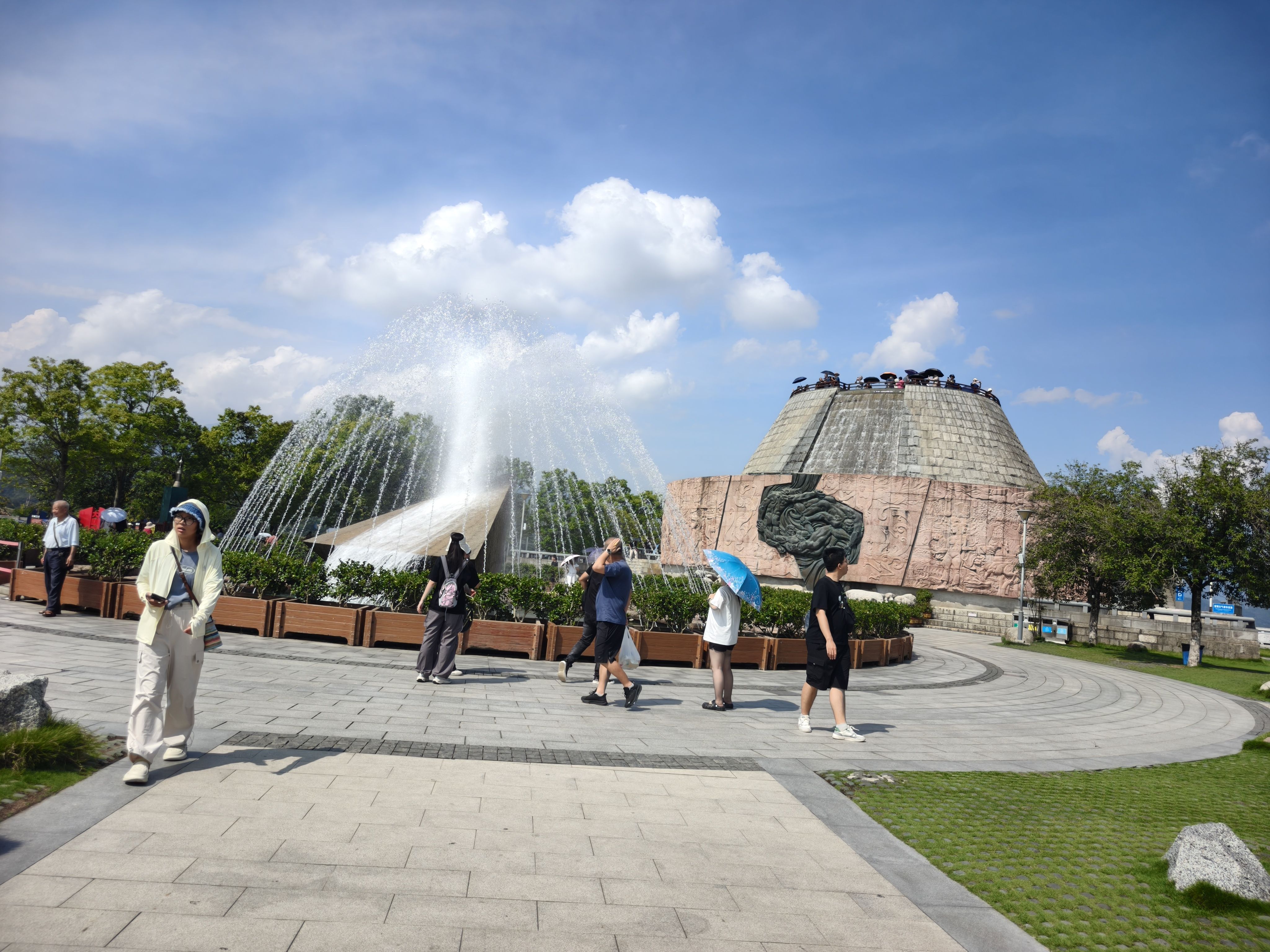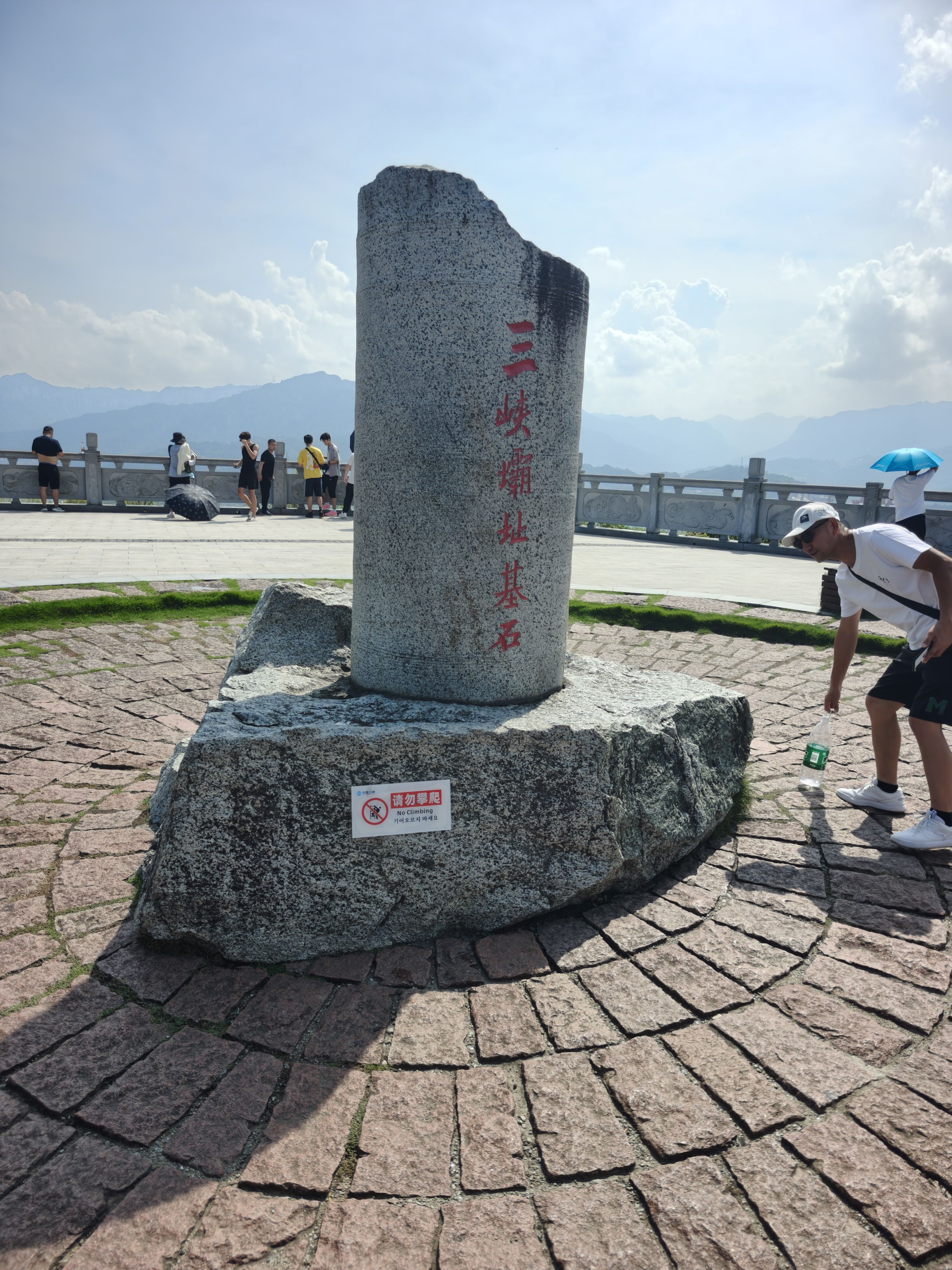 中午游船旅程结束下船,吃了自助餐以后,上车正式开始三峡大坝之旅。今天本来天气预报是阴有中雨,结果就早上阴了一会儿,之后就阳光明媚,蓝天白云。太阳晒在皮肤上火辣辣的,清晰感受到了阳光的压力。今天感受到了秋老虎的厉害,汗出了一身有一身。还好有些内容是博物馆里,体验馆里,相对舒服很多。还是有不少人完成不了游览路线,受不住天气的炎热。