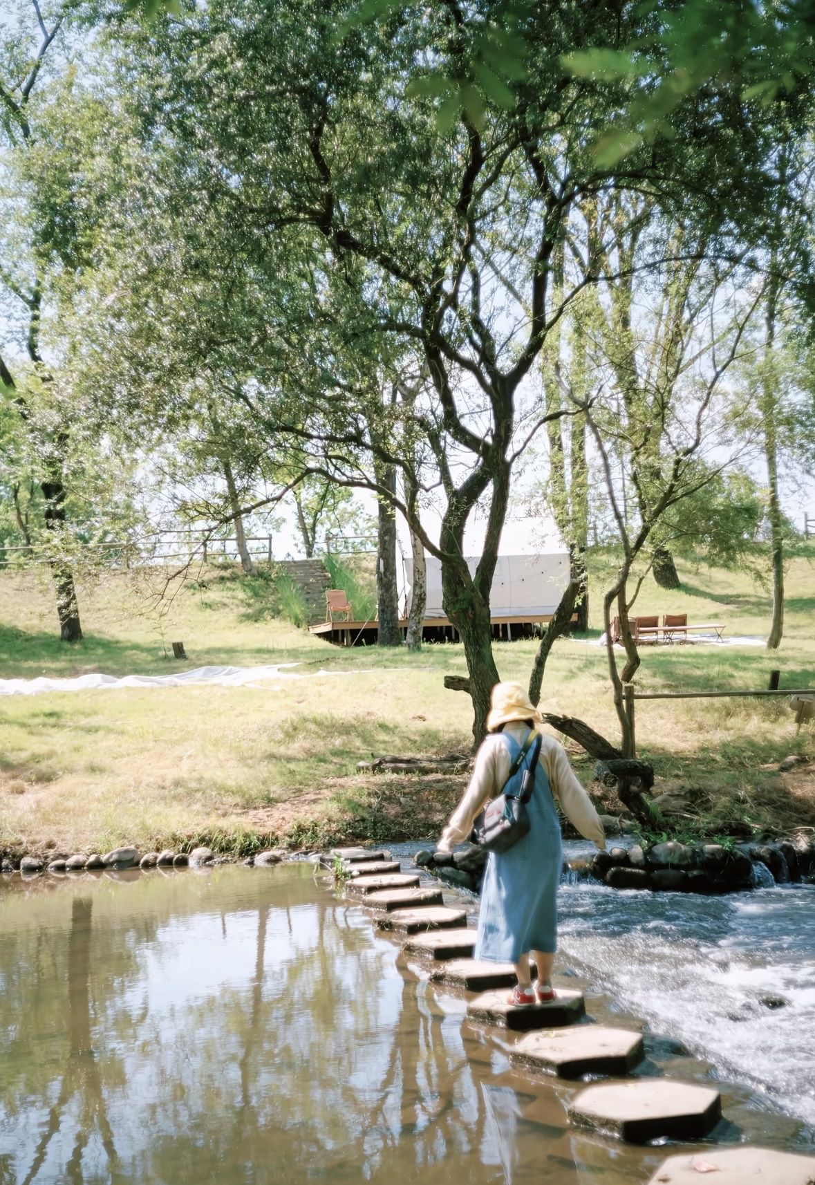 小朋友换上泳衣,在浅水区扑腾玩水,我们在旁边沙滩椅上躺平晒太阳,耳边是溪水潺潺,太治愈了~