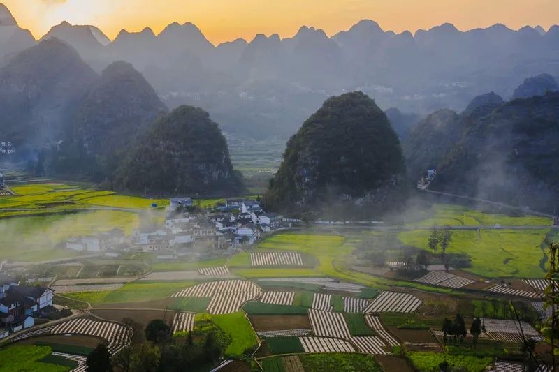 - **特色**:喀斯特地貌中的田园诗意,油菜花与布依族村寨。