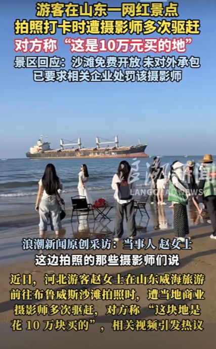 游客在山东威海布鲁斯沙滩拍照,遭摄影师多次驱赶,声称拍照区域是他们花10万元买的,景区回应,沙滩是免费开放的,没有外租,将对摄影师进行处罚!
