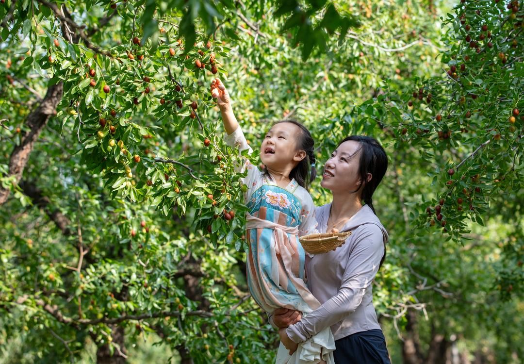 次日清晨,采风团赴枣博园,望海亭下骑行者、枣林间跑团与绿色枣林相映,勾勒 “生态乐陵” 活力。朱集镇千年枣林中,枣农打枣、游客采摘、老枣树下农民画教学的场景,既显千年枣文化底蕴,更绘乡村振兴新图景。