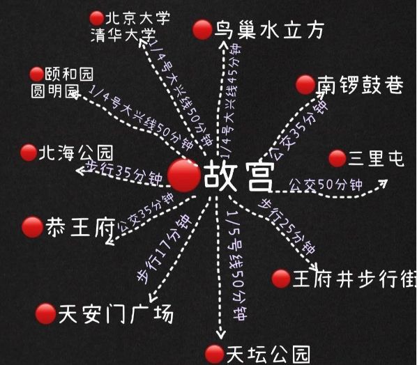 以故宫作为中心点,最近的景点是天安门广场,游客可以选择步行17分钟到天安门广场参观,也可以选择步行25分钟到王府井步行街游玩;若时间允许的,可乘坐地铁或者公交车,到更远的地方游玩,推荐前往颐和园圆明园、三里屯、天坛公园等景点。
