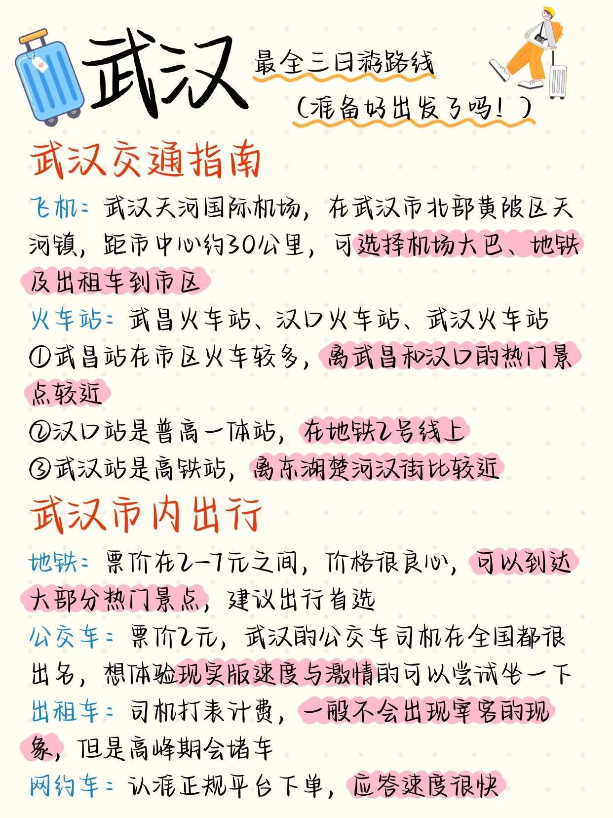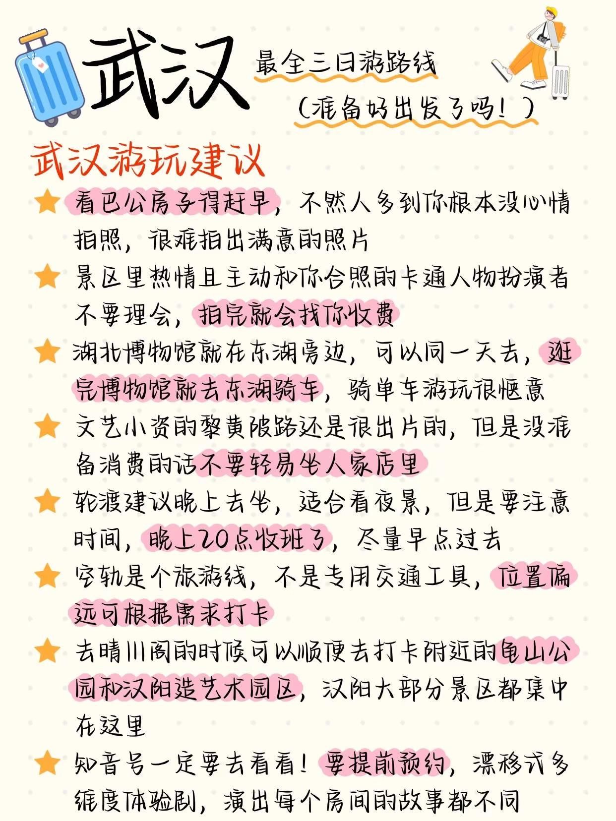 本地人手写的武汉三日游攻略快快收藏好。来到武汉真的不想走,主要是因为这里有好多好吃的美食和好看的景点,不过还是建议国庆来的姐妹们提前做好攻略再出发,不然很容易踩坑-武汉游玩建议看巴公房子得赶早,不然人多到你根本没心情拍照,很难拍出满意的照片景区里热情且主动和你合照的卡通人物扮演者不要理会,拍完就会找你收费湖北博物馆就在东湖旁边,可以同一天去,逛完博物馆就去东湖骑车,骑单车游玩很惬意文艺小资的黎黄陂路还是很出片的,但是没准备消费的话不要轻易坐人家店里轮渡建议晚上去坐,适合看夜景,但是要注意时间,晚上20点收班了,尽量早点过去-武汉住宿指南武昌区附近:武汉的市中心,也是大部分游客选择住宿的首要选择,距离景点很近,打卡很方便汉口区附近:对住宿环境要求比较高的朋友可以选择,这边基本都是江景房,但价格比较贵光谷广场附近:学生党和穷游党可以选择这里,这里虽然附近景点少,但是价格便宜武汉火车站附近:这里的酒店类型也很多,很适合需要第二天赶早班车的朋友,交通很方便-武汉市内出行地铁:票价在2-7元之间,价格很良心,可以到达大部分热门景点,建议出行shou选公交车:票价2元,武汉的公交车司机在全国都很出名,想体验现实版速度与激情的可以尝试坐一下出租车:司机打表计费,一般不会出现宰客的现象,但是高峰期会堵车网约车:认准正规平台xia单,应答速度很快#武汉 #旅游 #武汉美食 #旅游攻略 #武汉旅游攻略