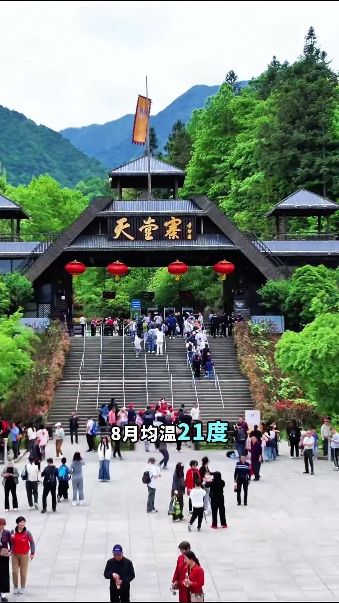 森林覆盖率96.5%,7-8月均温21度。有大别山主峰天堂寨等景区,还能体验桃花冲漂流。