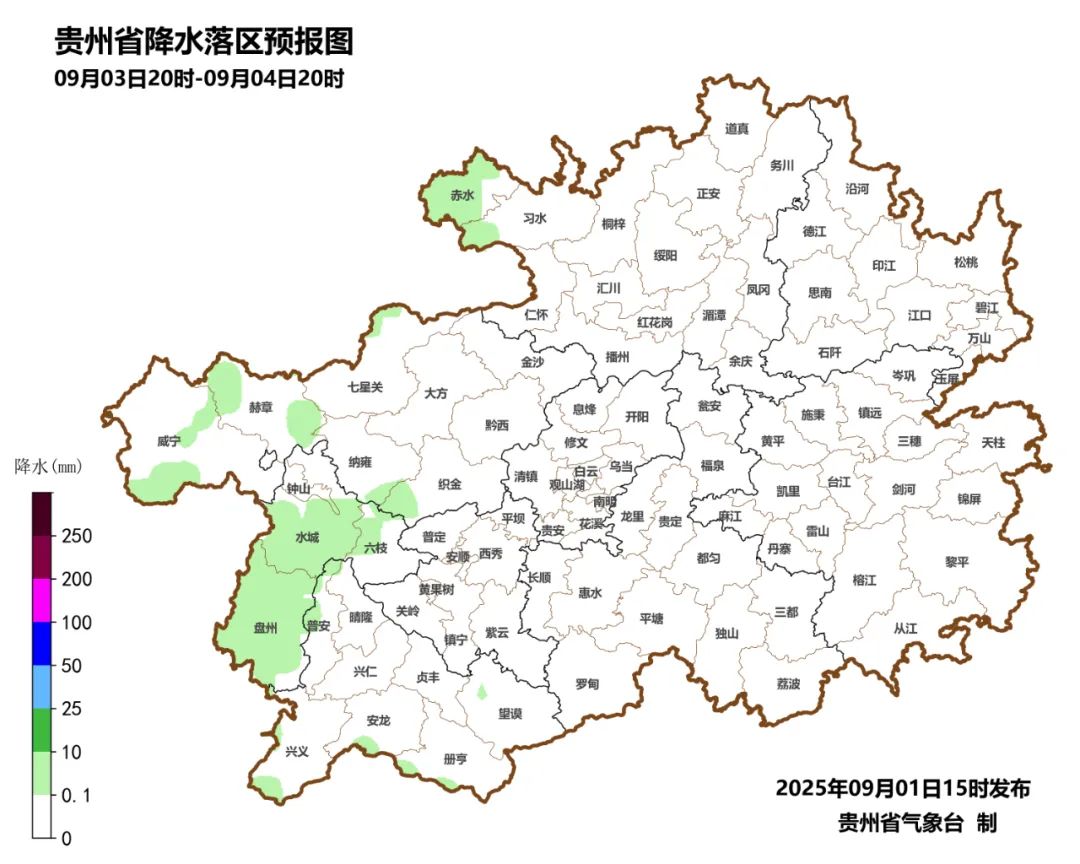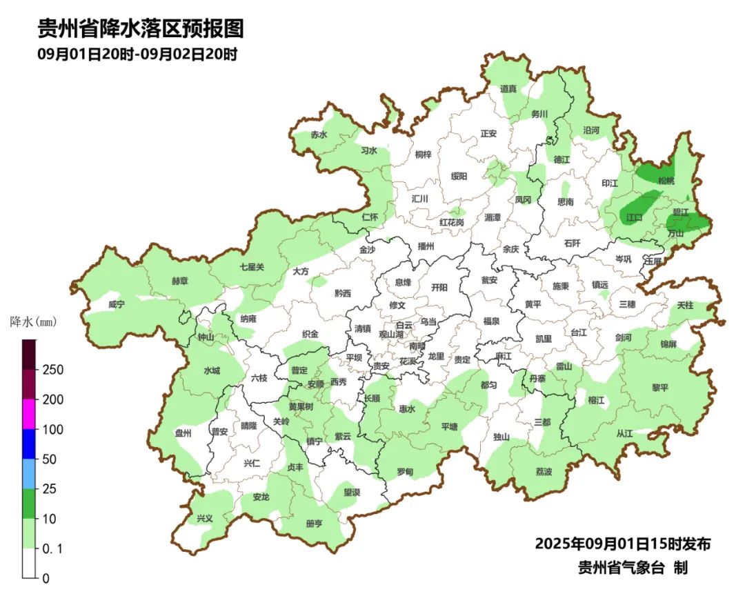 31日08时至9月1日08时,暴雨出现在铜仁市的江口1县域内的1个观测站(乡镇最大为江口县坝盘镇头坝溪54.2毫米),大雨有14个观测站,中雨有58个观测站,小雨有642个观测站。有10个县(铜仁市的江口、沿河、碧江,黔东南州的岑巩、镇远,黔西南州的兴义、兴仁、册亨、安龙、普安)15站次出现短时强降水,小时雨强最大为江口县坝盘镇头坝溪48.6毫米(2025-08-31 14:00)。