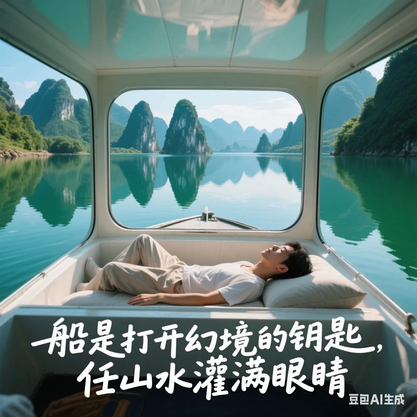 而在黔西南万峰湖,躺进游船观景舱的年轻人发现更极致的解法:**“船是打开幻境的钥匙,你只需躺平,任山水灌满眼睛。”** 翡翠湖面倒映喀斯特峰林,恍如“行走在天空的镜面”。