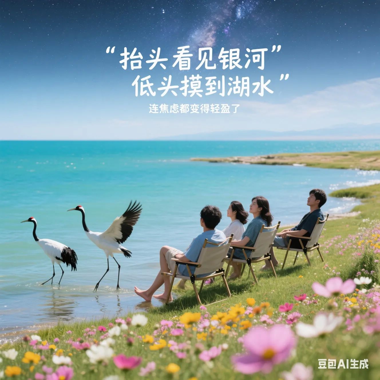帮我生成图片:### 20℃的夏天,在青海湖边被风治愈:松弛感是都市人的终极奢侈品