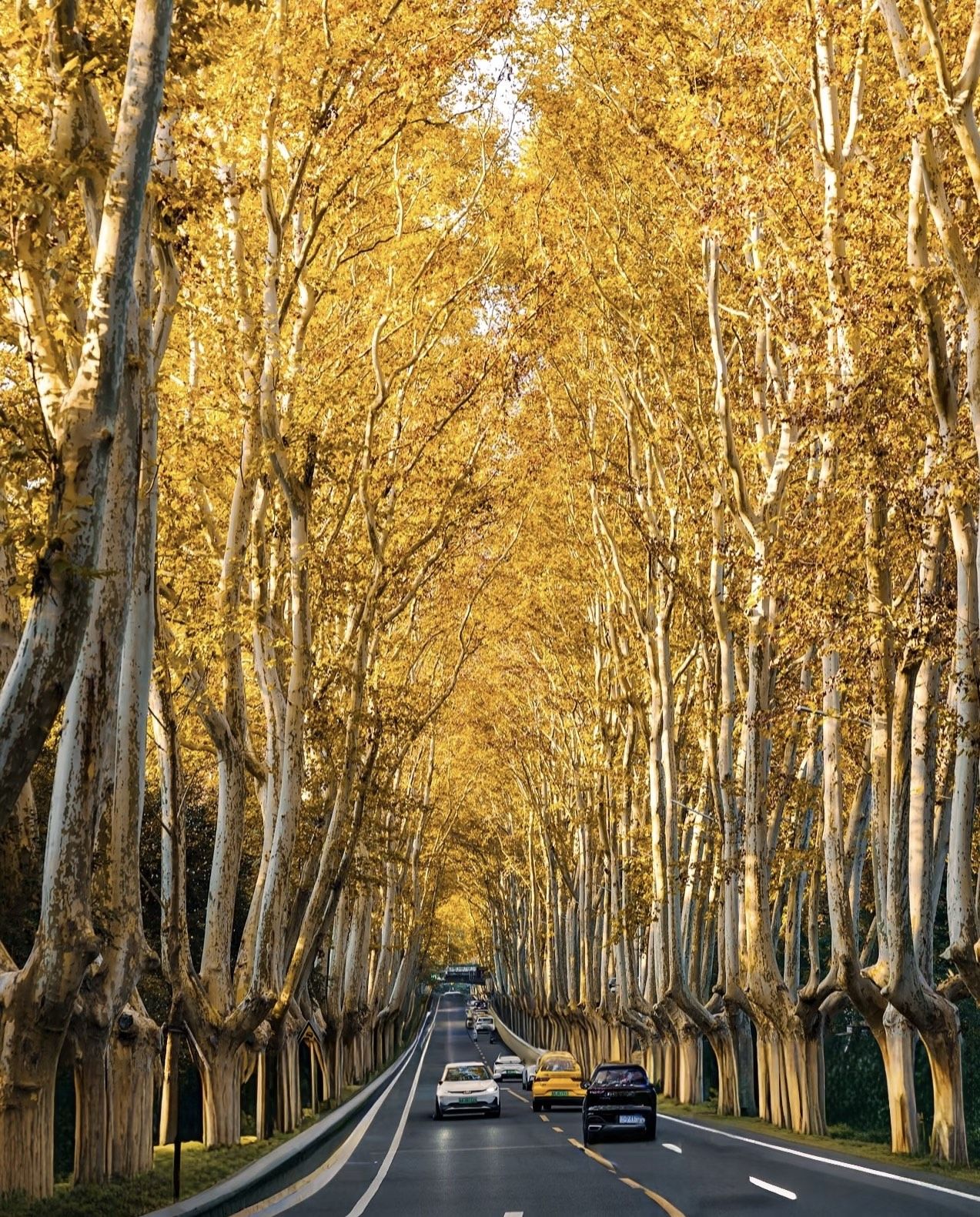 梧桐大道:道路两旁梧桐树金黄的树叶随风飘落,宛如金色的海洋。