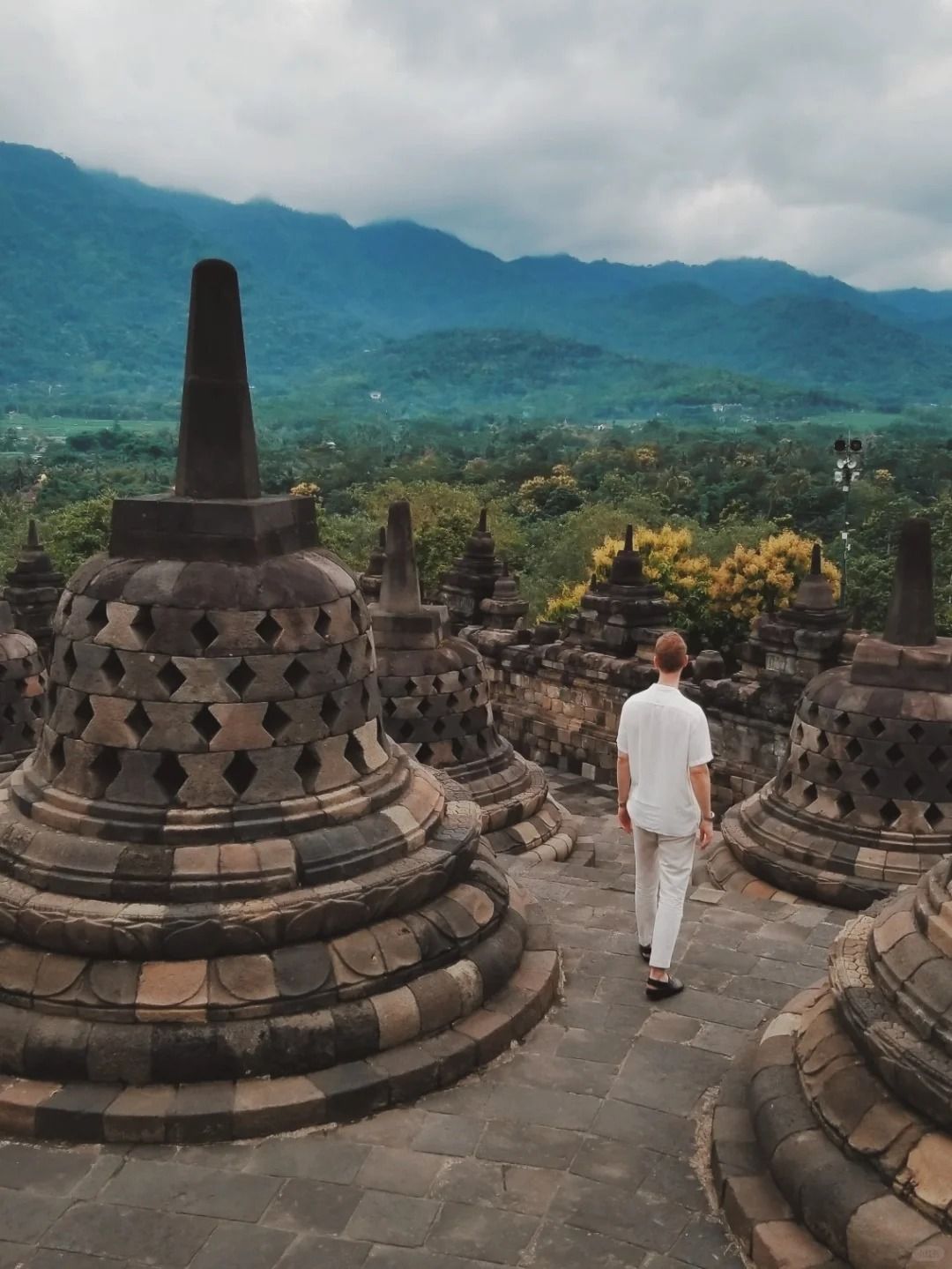酒店落址于 Central Java 马格朗婆罗浮屠 Majaksingi 村,推窗即见婆罗浮屠的阶梯金字塔轮廓—— 那是 8 世纪夏连特拉王朝的杰作,曾因火山爆发沉睡百年,19 世纪重见天日、20 世纪修复新生,如今仍以密宗曼荼罗布局,用塔基、塔身、塔顶三层结构,承载佛教 “戒、定、慧” 的修行境界。
