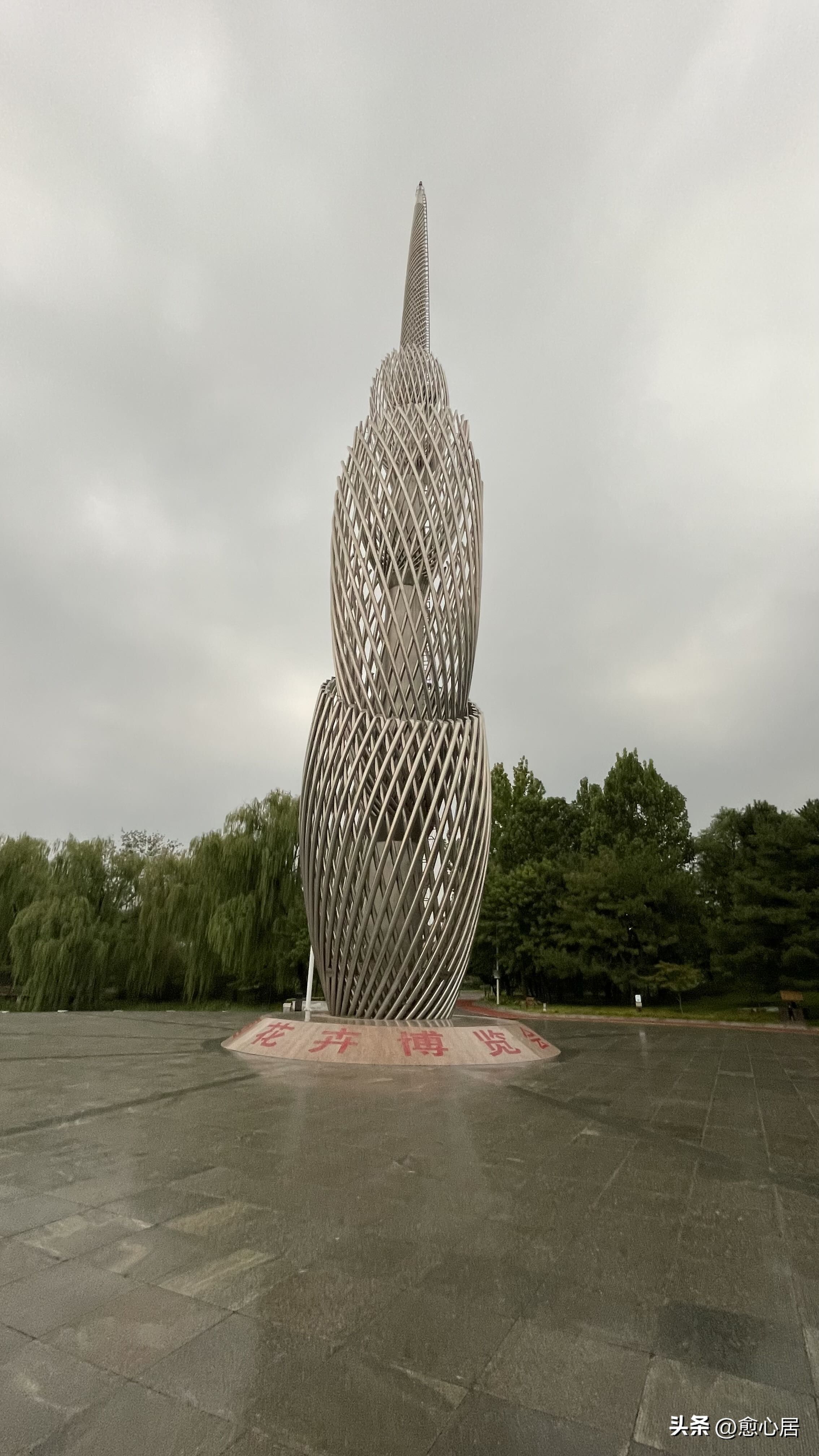 在凝望了一下中心广场的标志型建筑花博塔,在雨中像朵像一朵含苞待放的花,那交错的金属线条,延伸直上,更加高大壮观。