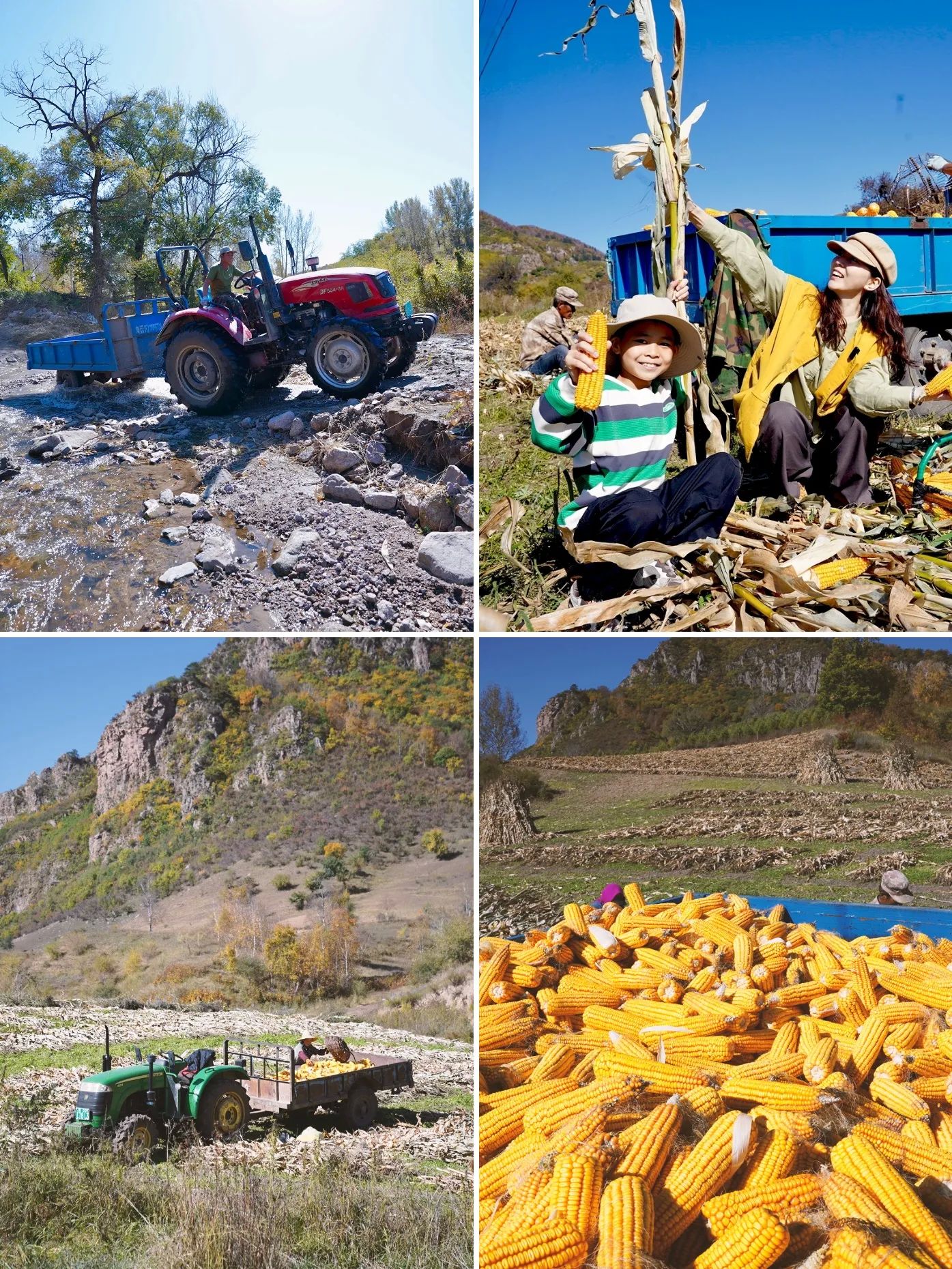 第二天一早,推开窗就是对面山顶的彩叶林,牛羊田园风光,河里鸭子戏水、大地丰收景象,村民开着拖拉机,往返运送收好的玉米和玉米杆,带着孩子和村民一起体验掰玉米,听他们讲丰收的故事,他们说今年收成还不错,种的玉米基本都是投喂牛羊~