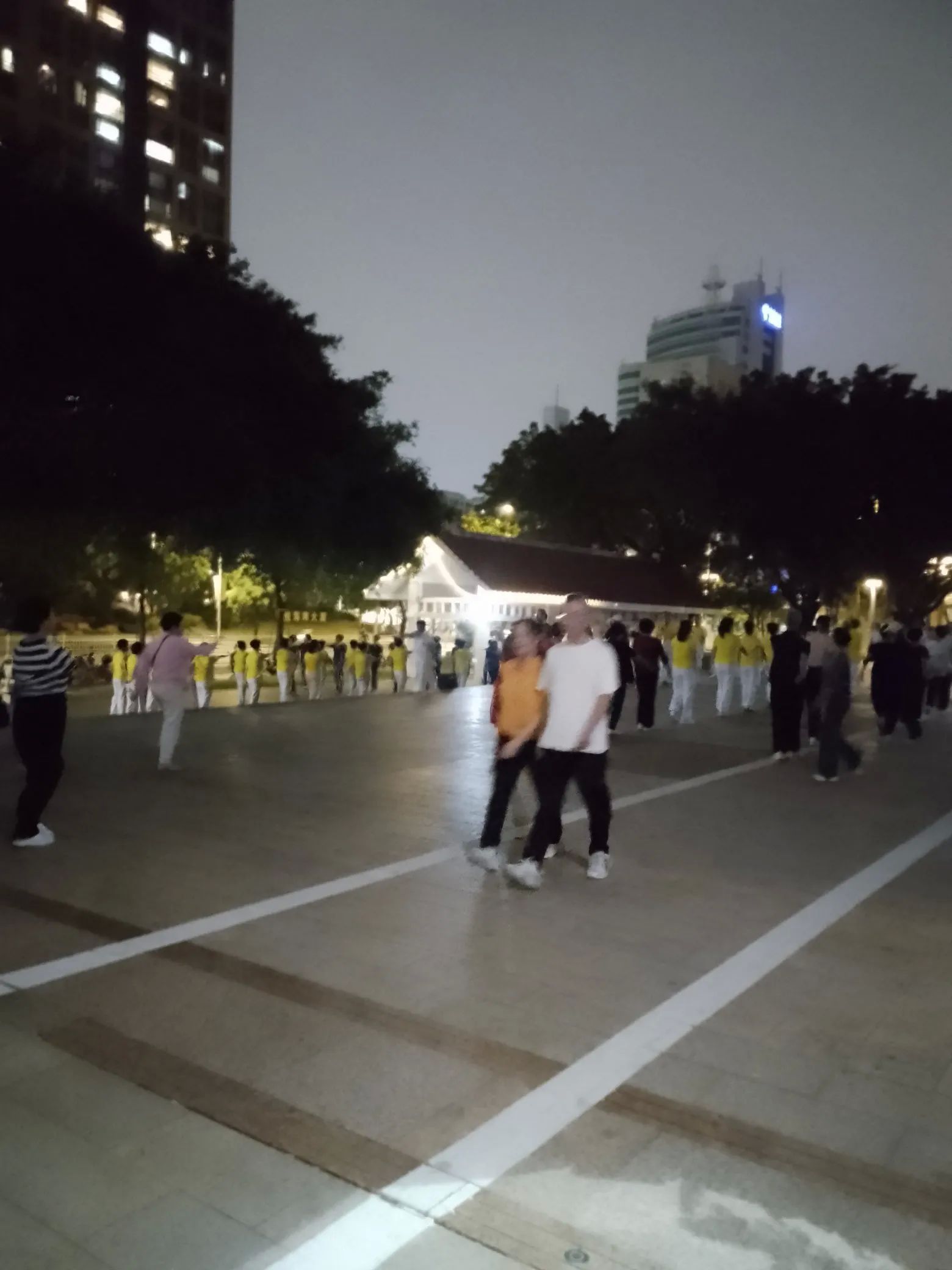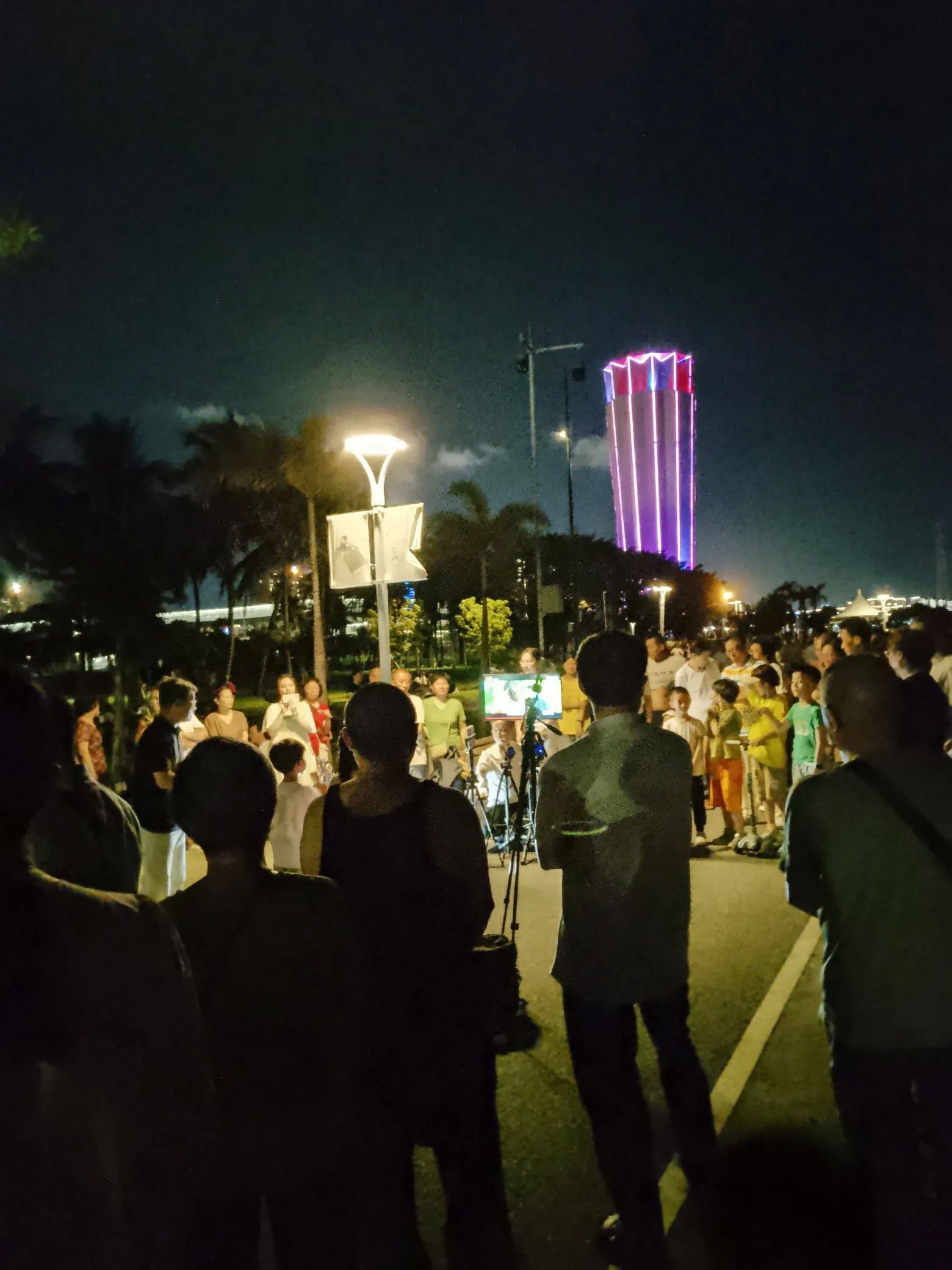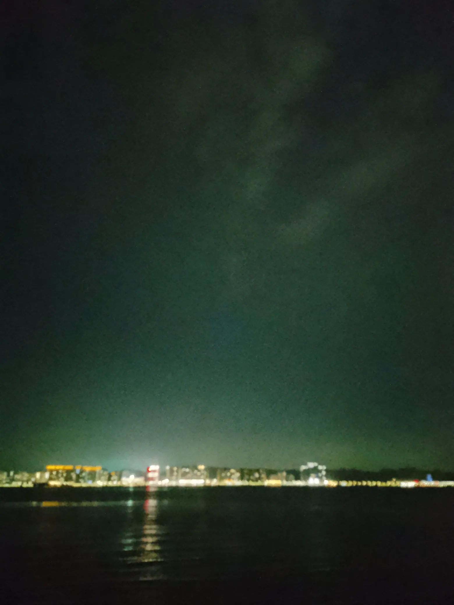 华灯初照,汕头礐石海碧波荡漾,灯火辉煌,人们各奔喜欢的地方,休闲快乐。在海滨长廊公园一带,大家都很活跃,跳起舞和唱起歌,健身操,漫步散步的人不计其数,唱歌还有直播间或卡地自唱,丰富了夜生活,有人在岸上眺望远处的夜景,礐石南滨路夜间的灯光翊翊生辉。与此同时,畅游内海湾的旅游船在海面航行,似一颗永不落的明珠在海面游荡,耀眼的灯光绽放五彩缤纷。