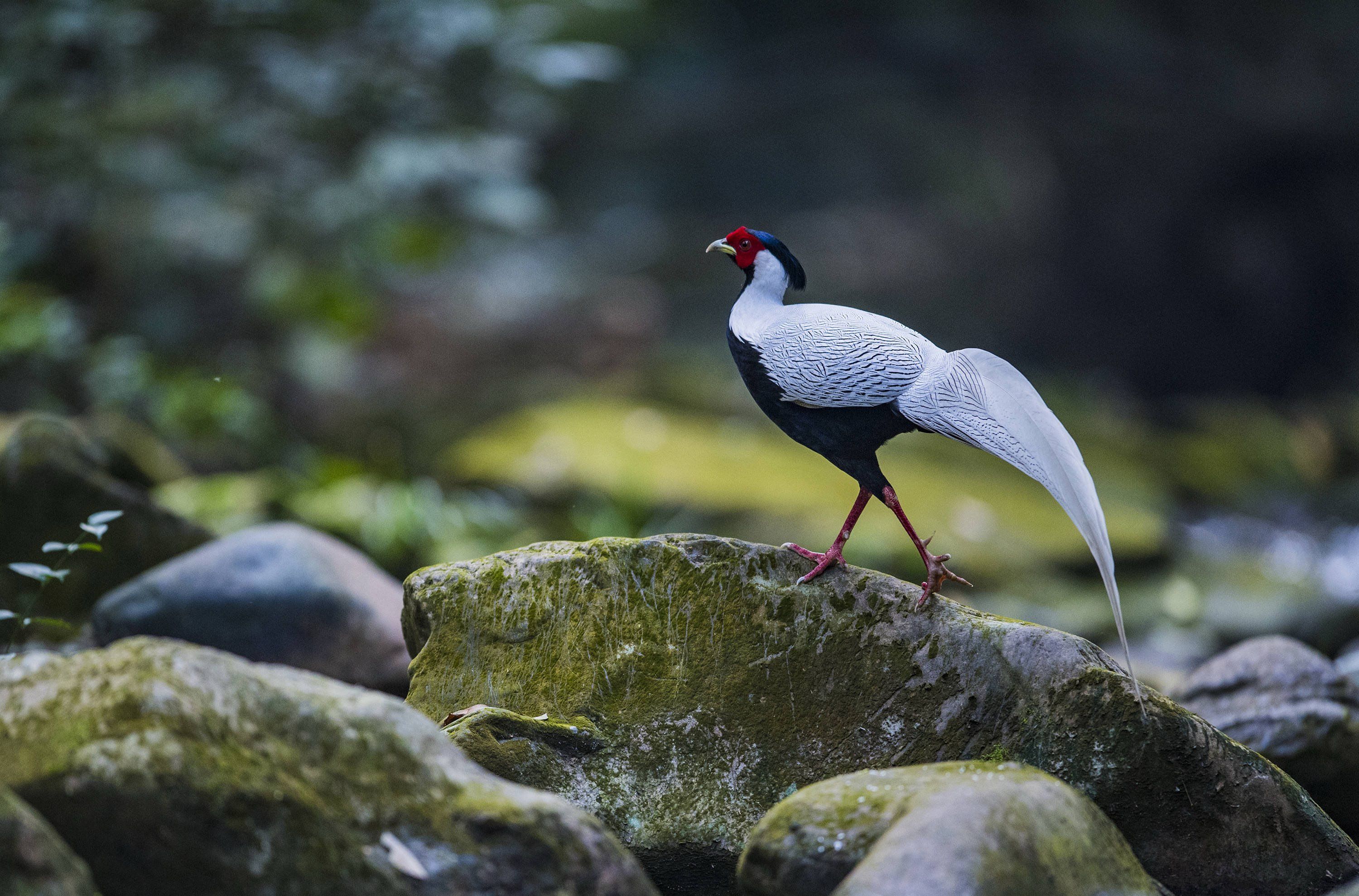 白鹇雄鸟上体白色并具黑色纹,下体黑色,头戴红色肉冠,脚呈红色,尾羽修长,姿态优雅,有“白凤凰”“林中仙子”的美称。