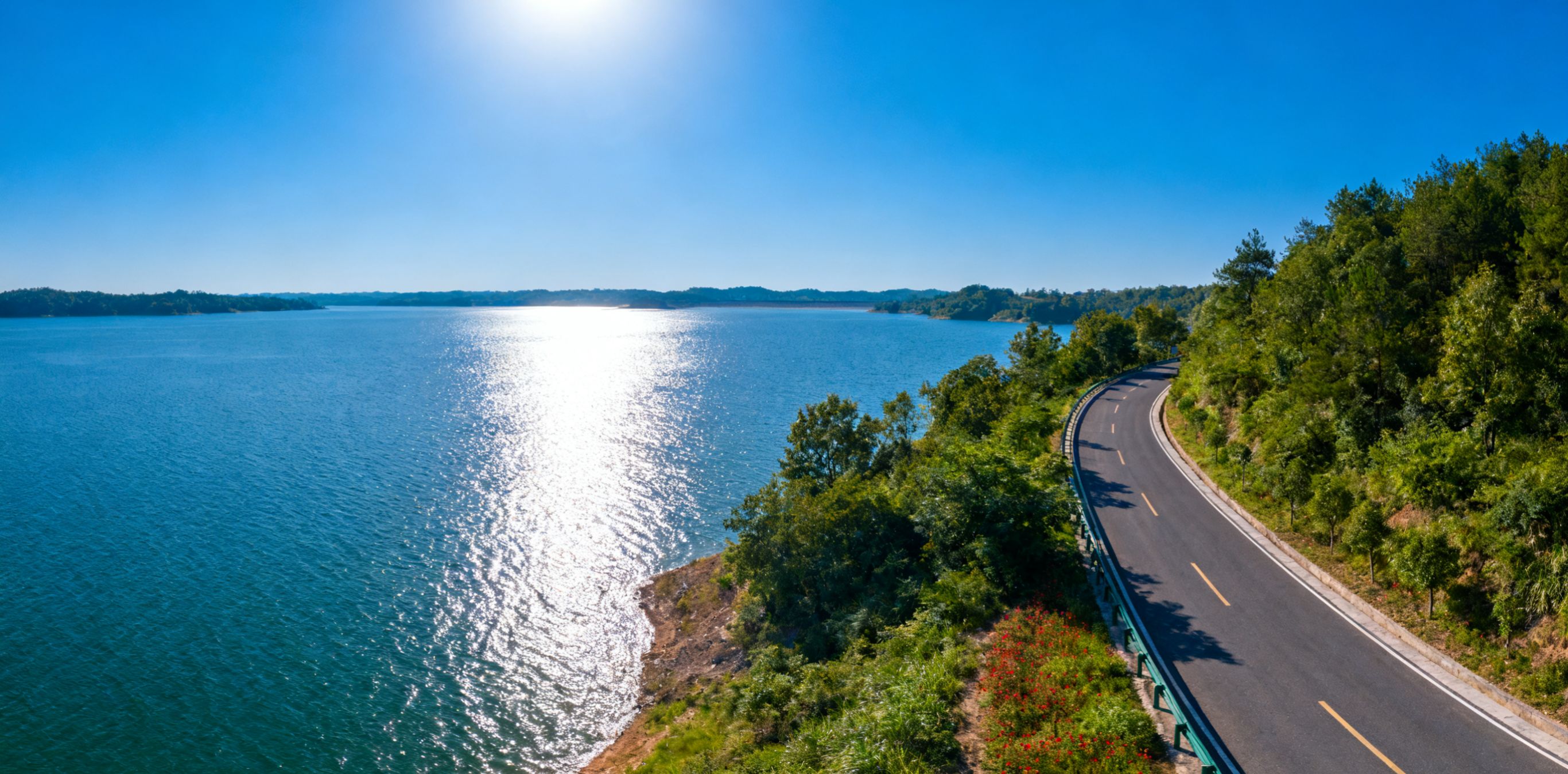 水岸线蜿蜒曲折,开车就像在画里穿梭。一侧是波光粼粼的湖面,一侧是绿意盎然的山丘,随处停车都能走进风景里。