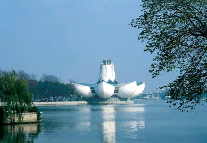 再往东看,东岸边,是案山公园,往北看,看到外观似白色莲花形状的景点,是祖籍平湖的李叔同纪念馆,白色莲花,让人想起多才多艺的弘一法师李叔同的高洁品性。