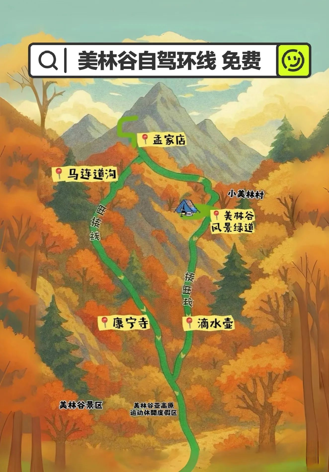 路线点位: 孟家店—马连道沟—康宁寺—滴水湖—美林谷绿廊—小美林村