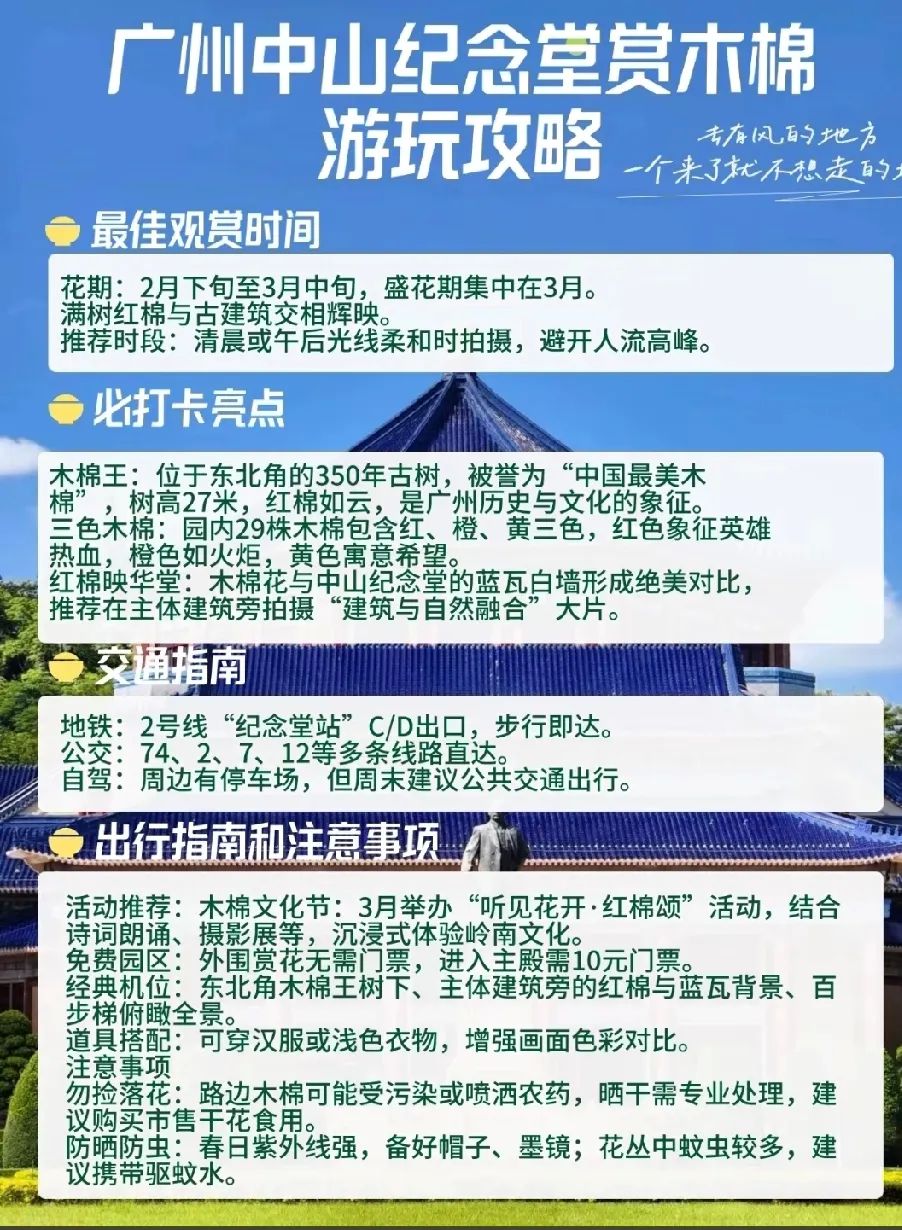 - 部分景点需要预约或者购票(如华南农业大学、云台花园),建议提前通过官方渠道查询。