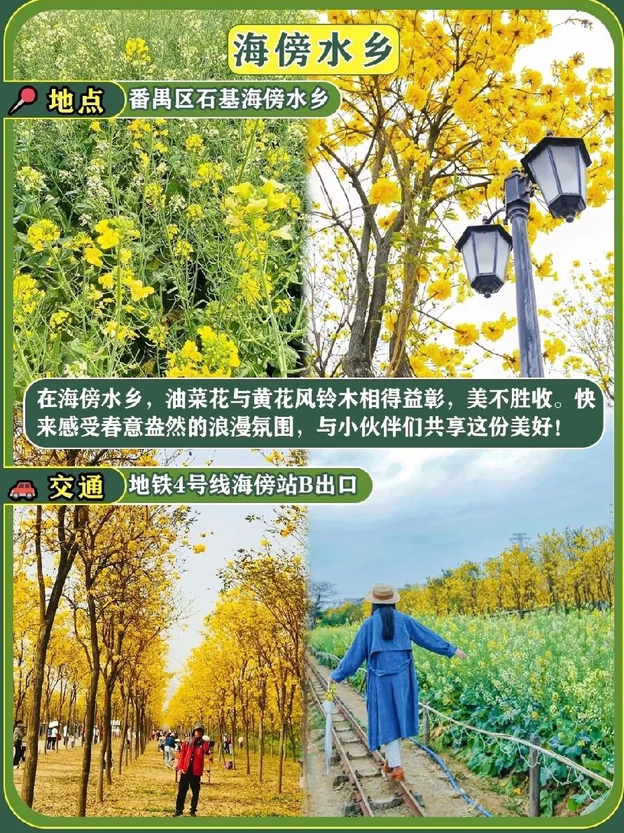 番禺海傍村的油菜花田由黄、紫、白三色交织而成,以黄花风铃木为背景,就像一个调色盘。免费开放,适合亲子野餐和田园摄影。