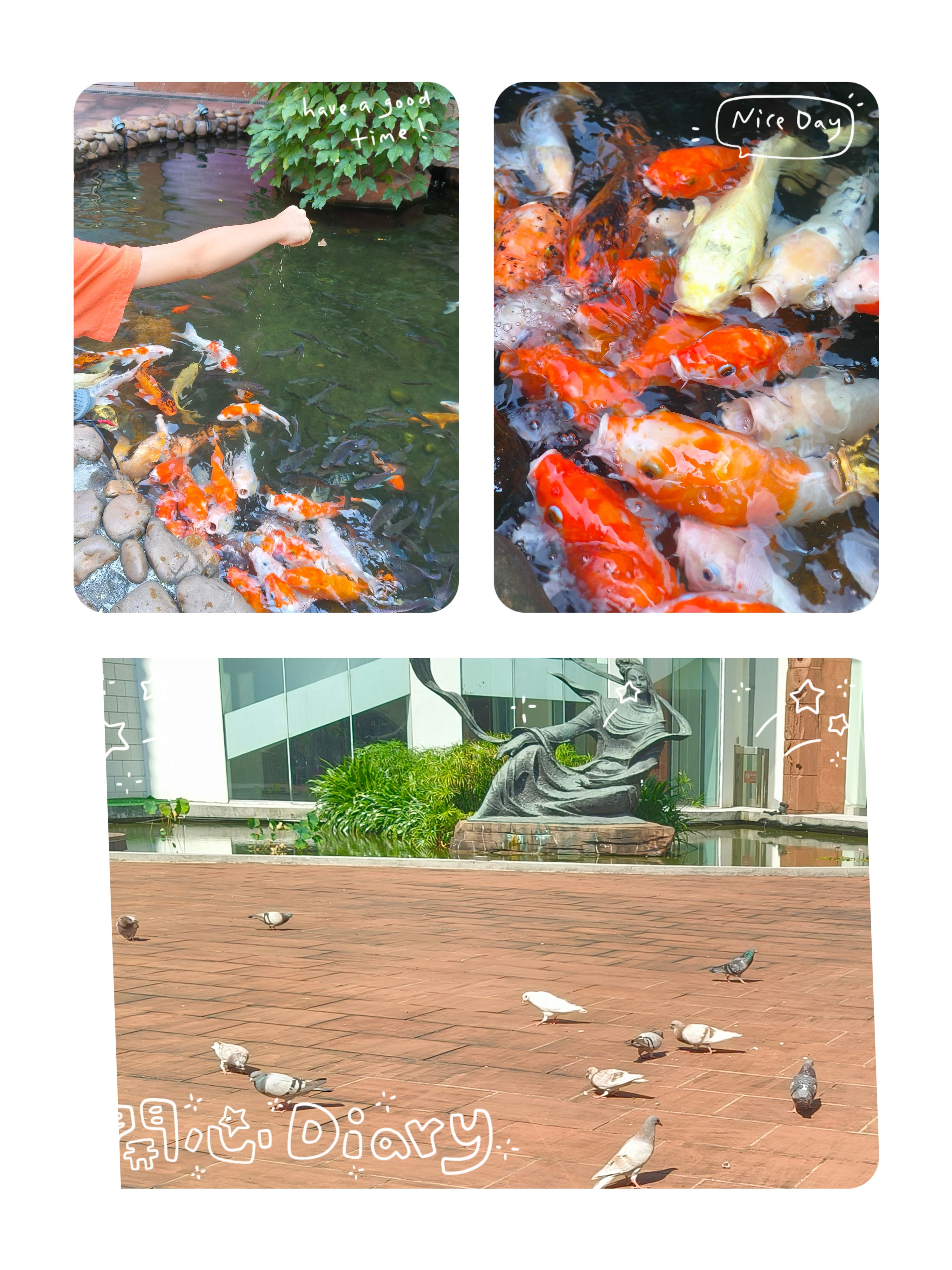 [呲牙]一楼还有很多小朋友带一些大米和面包来喂一只只胖胖的白鸽,还可以带面包和饼干来喂鱼,小朋友轻轻松松在这里待一天都可以,逛累了也有地方坐着休息,也有婴儿车集中放置区这些贴心的服务。