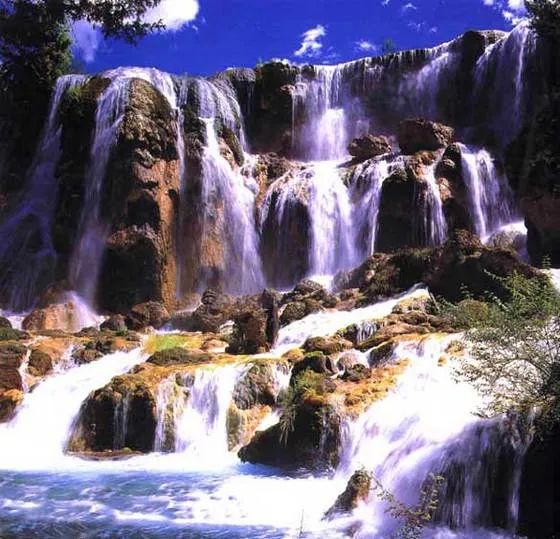 - 九寨沟风景名胜区:位于阿坝藏族羌族自治州九寨沟县漳扎镇,有碧绿的湖水、壮观的瀑布、原始森林和雪峰,四季景色各异,秋季五彩斑斓的山林倒映在湖水中,如天然油画,有五花海、镜海等多个特色海子。