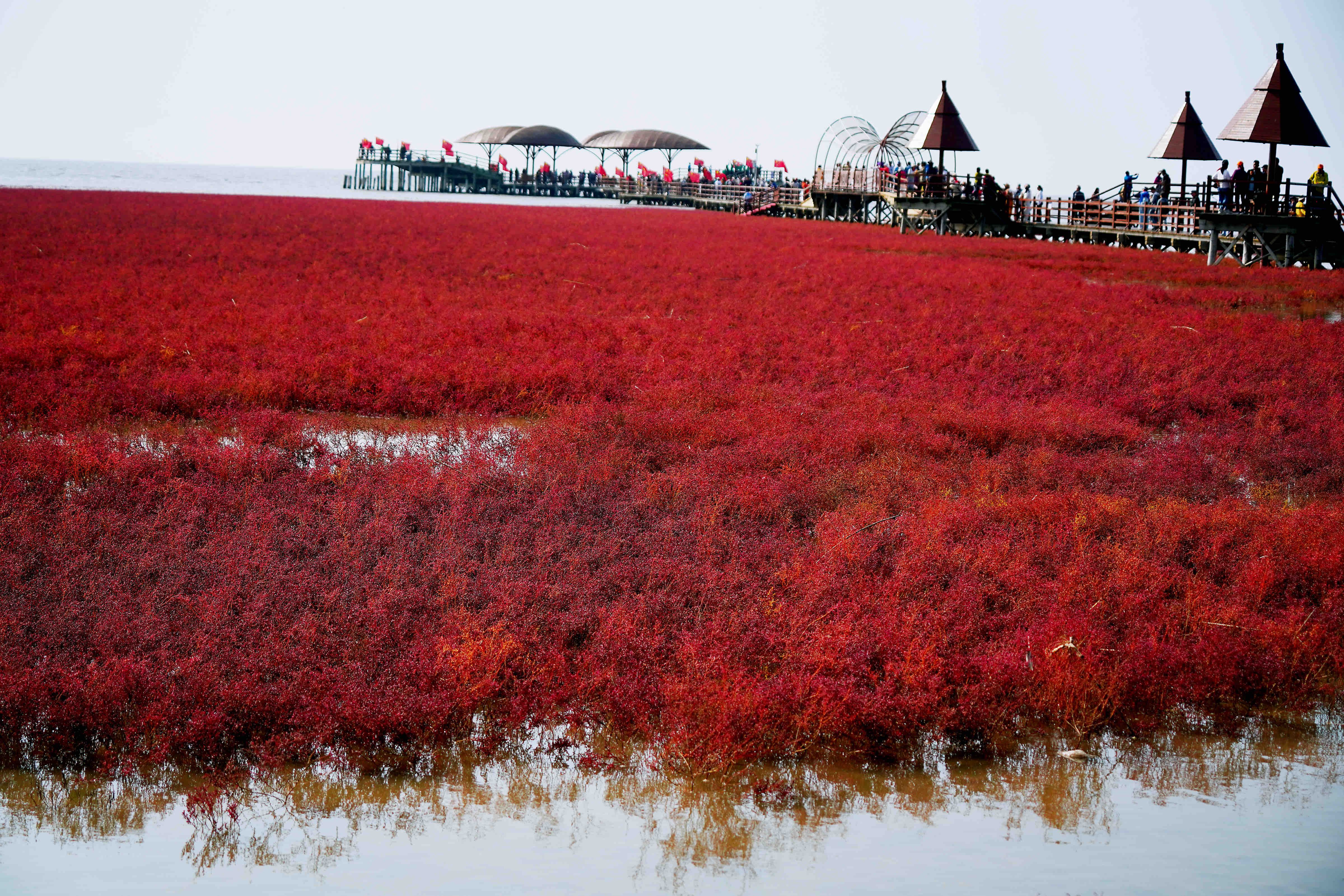 10月14日,抵达盘锦红海滩,景色令人震撼。红红的一片海域,如红色毛毯铺满大地,海鸥在红色海洋中飞翔,红白相间,一片祥和,大自然的和谐具象化。红海滩另一侧是黄色的稻田,此景宛如天上之景遗落人间。