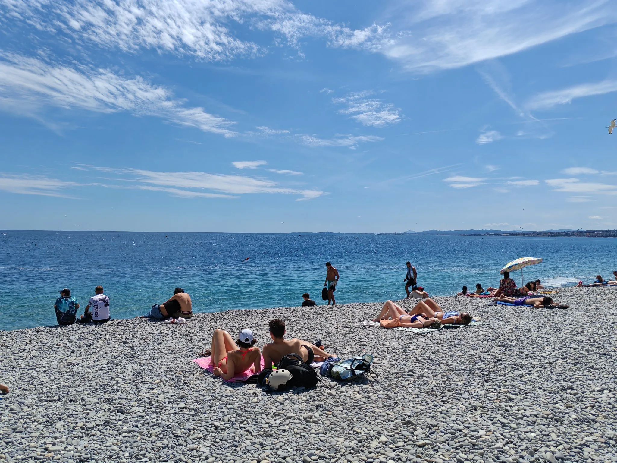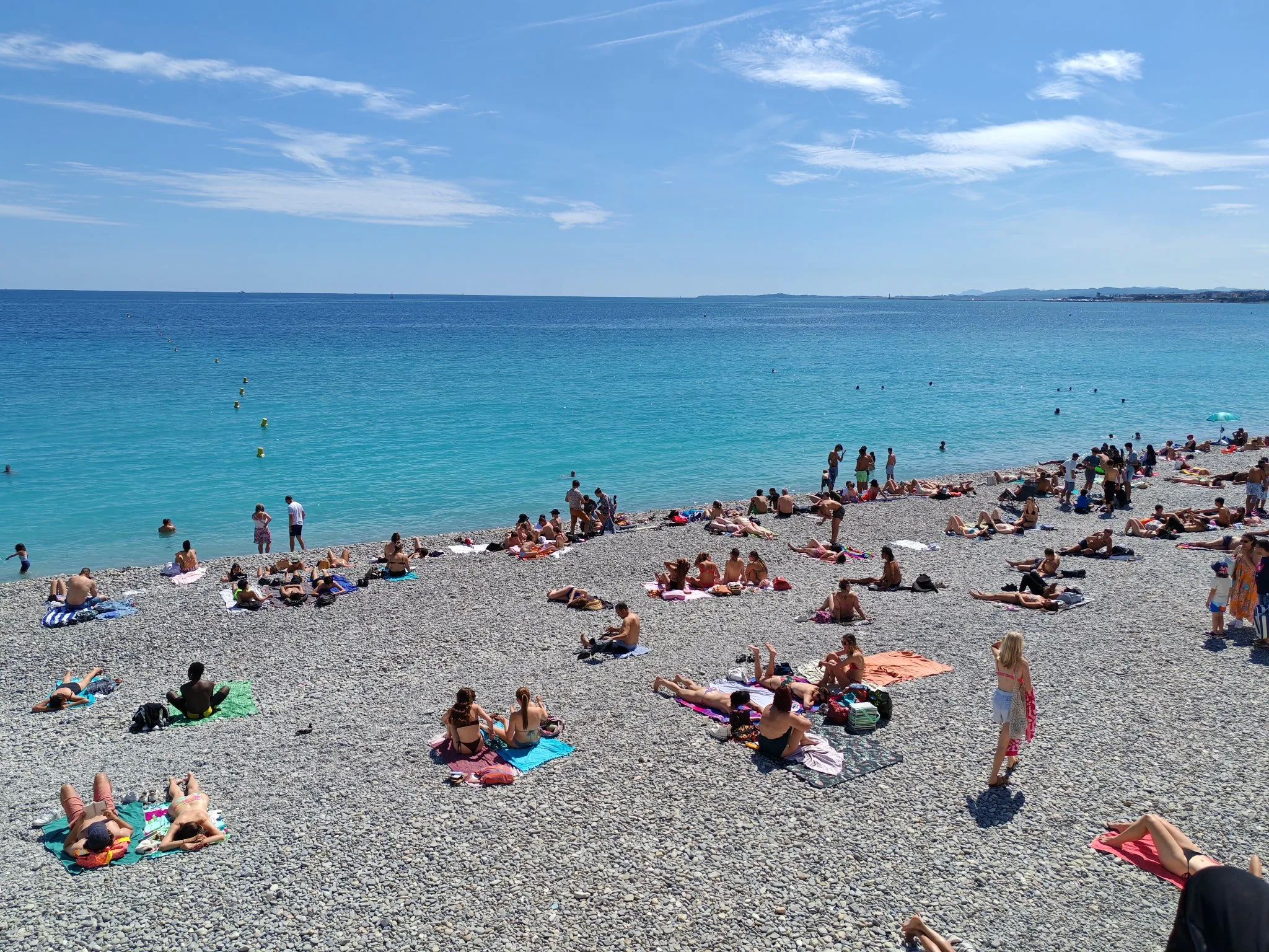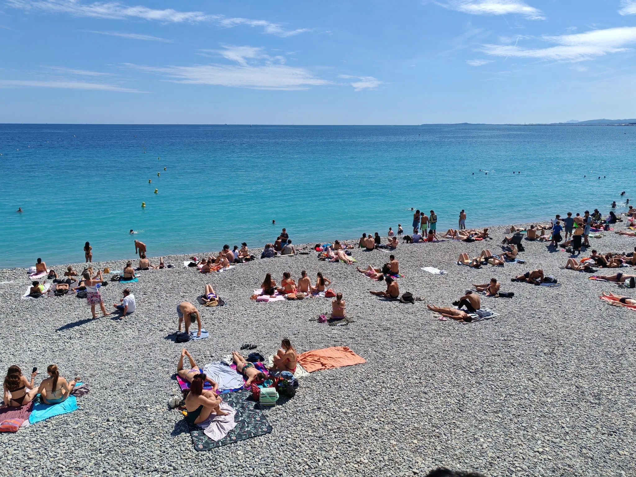 从城堡山走下来是尼斯港口和天使湾大道,今天正好是周日,海滩上躺满了日光浴的尼斯当地人。风和日丽,一片祥和。