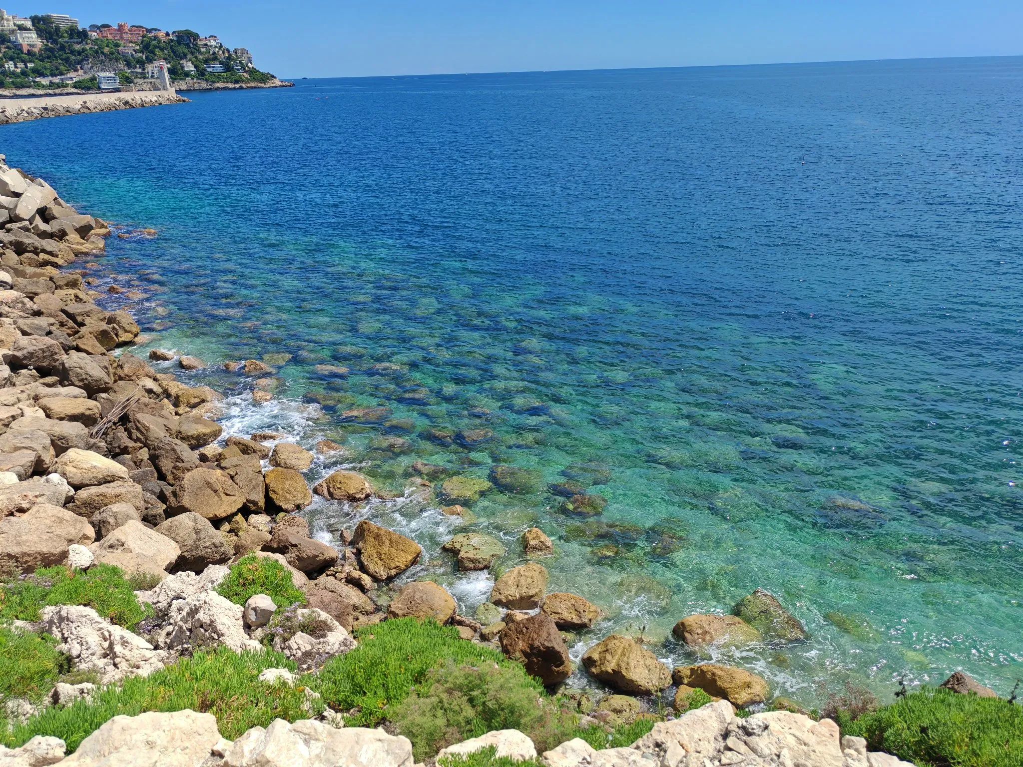 我在海岸边仔细观察,终于发现为什么尼斯这边海岸海水特别清澈碧绿,原来尼斯海岸边全是大礁石,沙滩上也全是鹅卵石,不含任何泥土。所以海水反复冲刷之下,不会卷起泥浆。