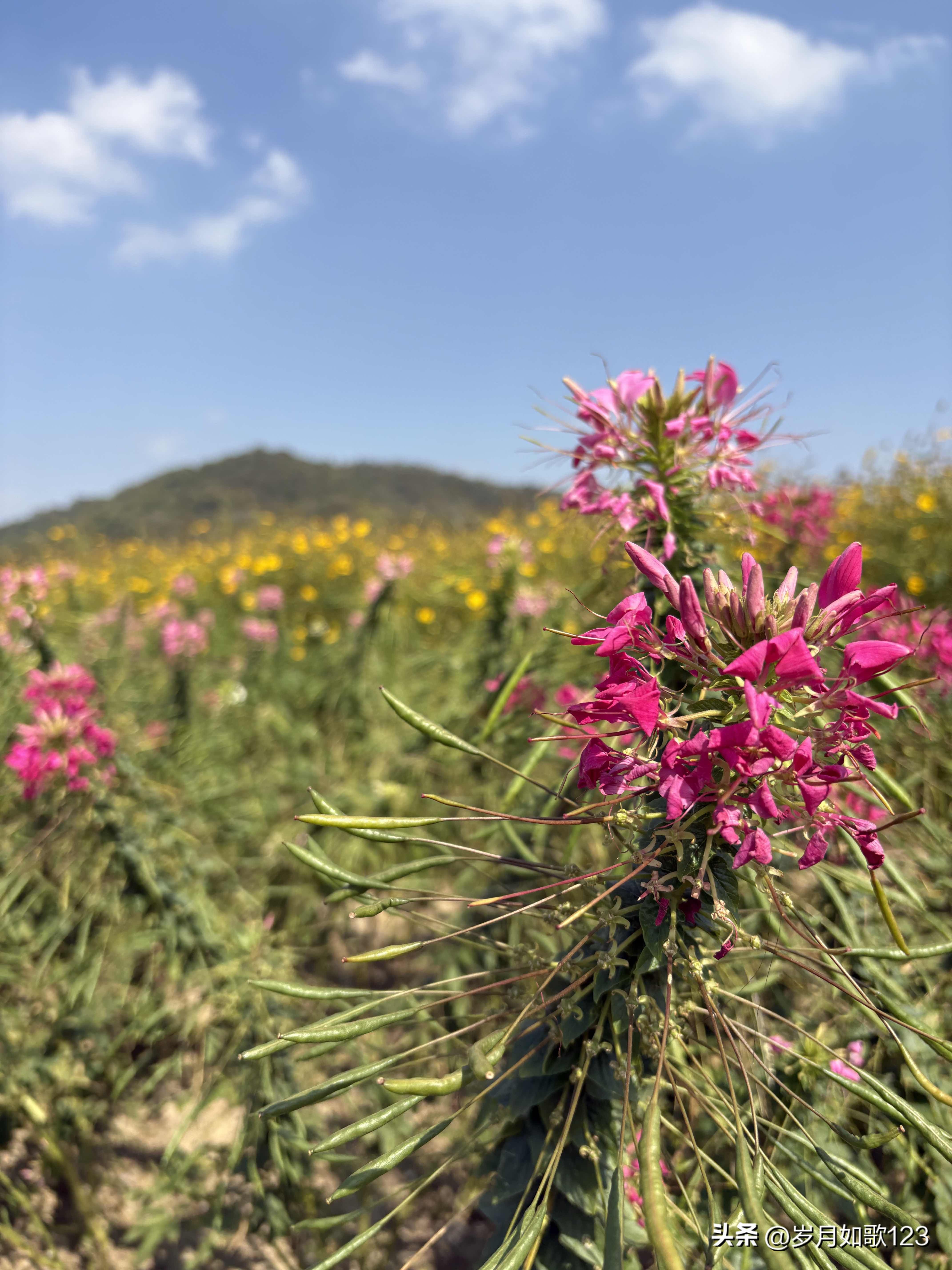 蓝天下,群山前,一大片醉蝶花映入眼帘,我随手一拍便是大片。醉蝶花的豆荚像芝麻的豆荚,它们定是同类。