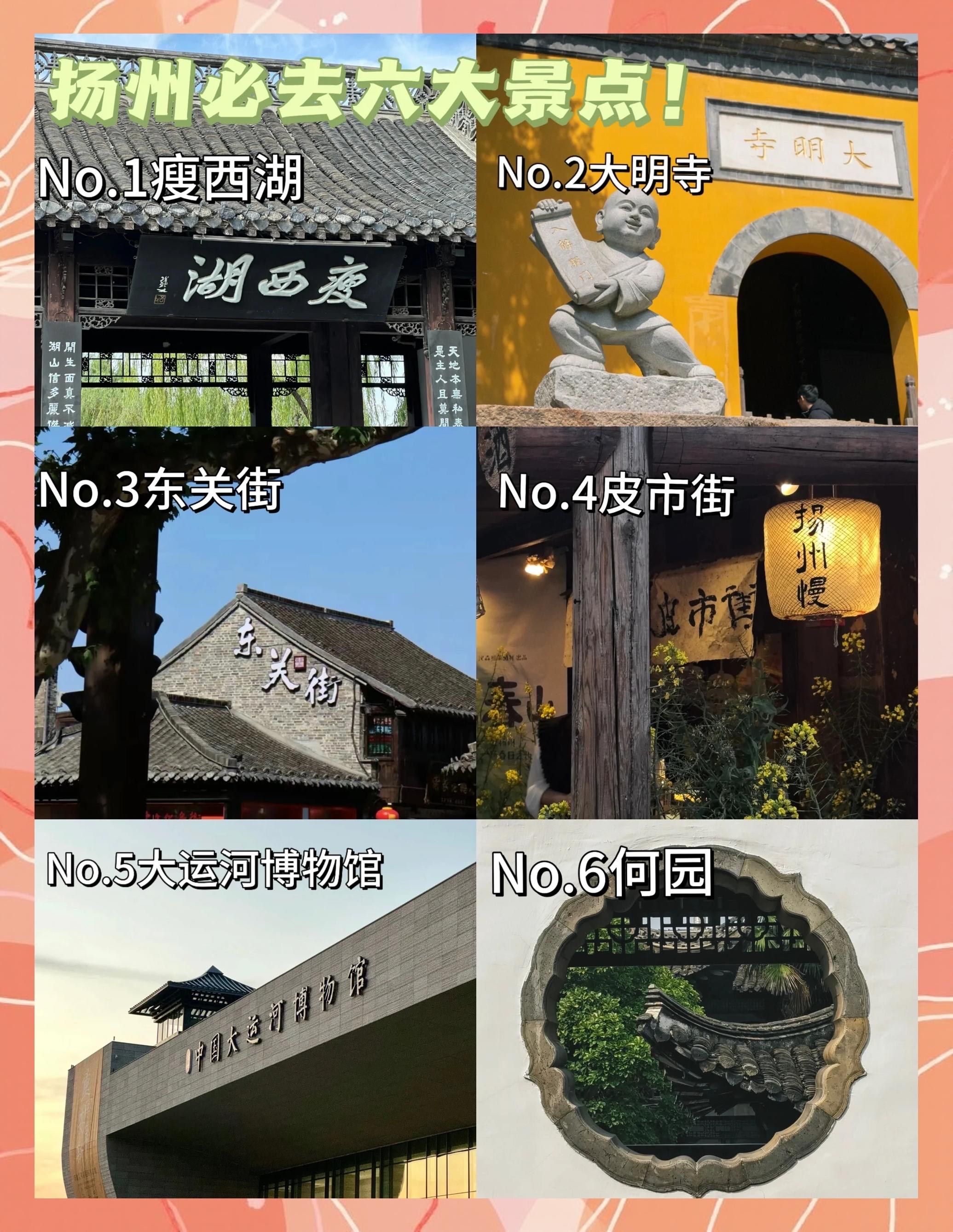 瘦西湖:这是扬州最著名的景点之一,以“瘦”而得名,湖光山色与古典建筑交相辉映,乘船游览或漫步湖畔,都是极佳的体验。