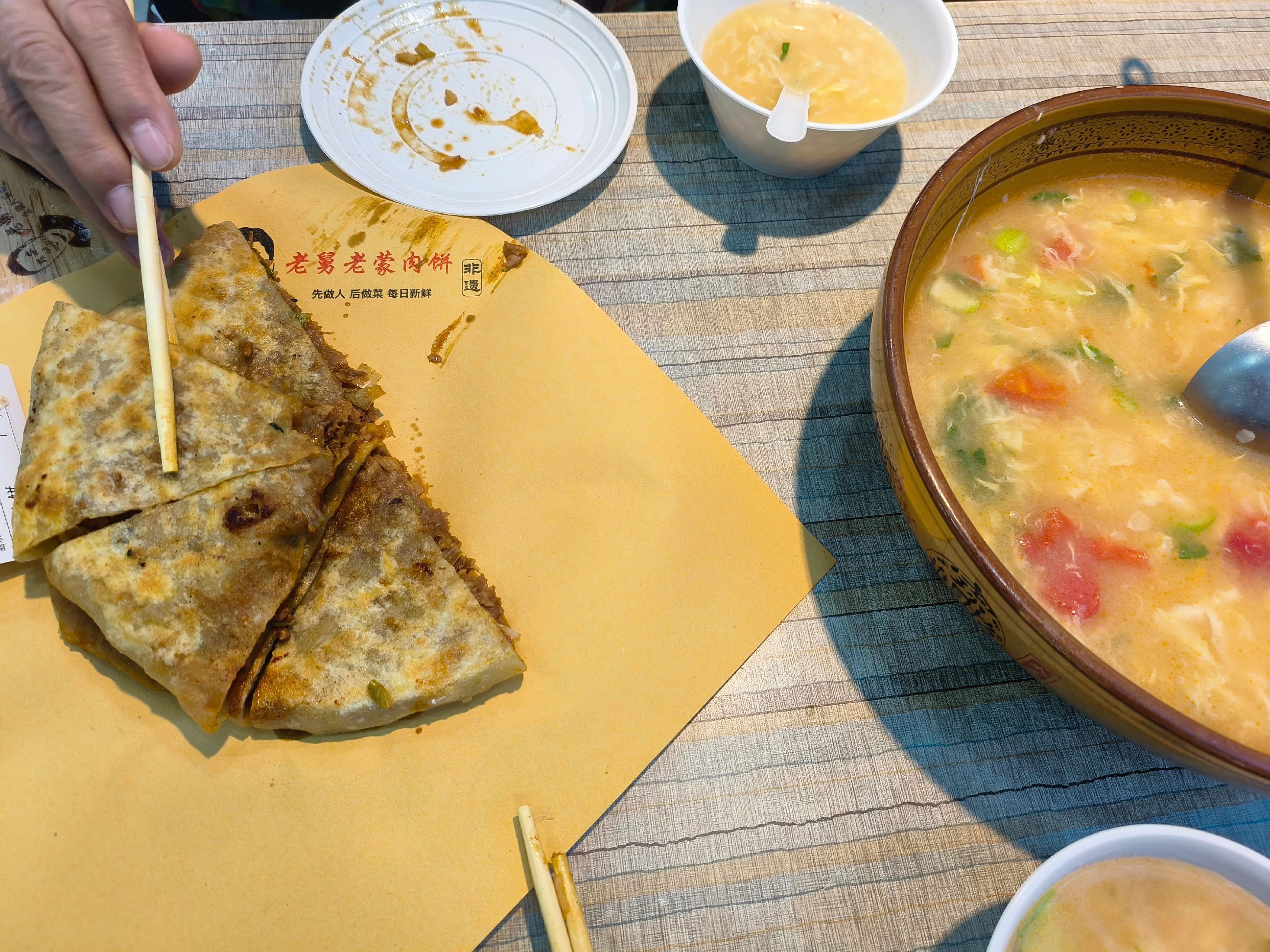 离塞罕坝南门往北不远,有个专门集住宿和餐饮的小镇。小镇有一家河北省最好吃的肉饼总店,叫“老舅老蒙肉饼”。当地人介绍,这个肉饼传承了千年,所以现在被列为非物质文化遗产。还说不吃他家肉饼,不算到过冀蒙交界处。不过的确好吃,皮薄又脆,肉馅很厚。