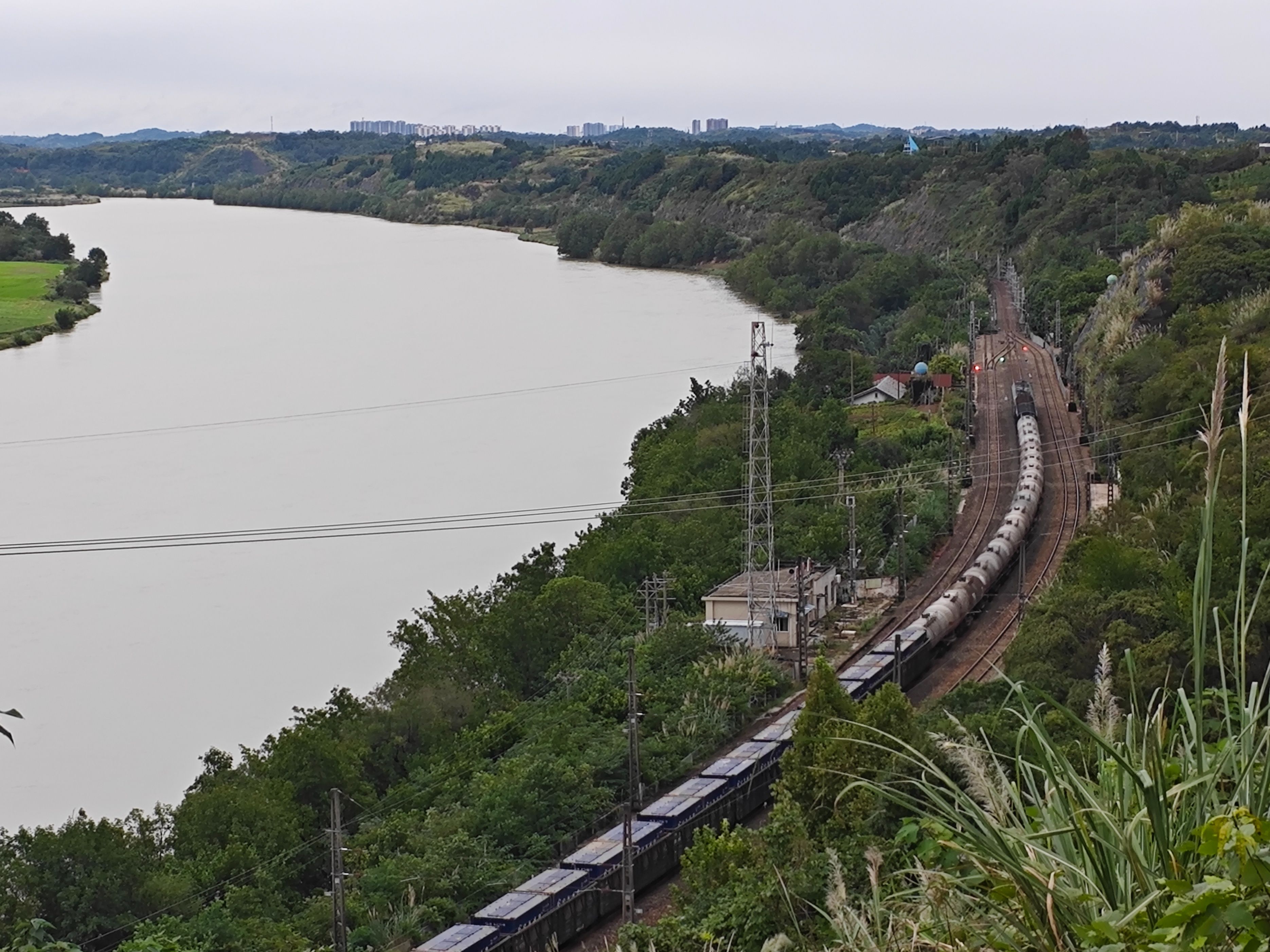 顺着步道往下走,不时能听到火车运行的轰鸣声——这正是仍在运营的老成渝铁路。带着儿子在半山腰驻足,看着货运列车缓缓驶过,读着路边介绍成渝铁路历史的石碑,仿佛也触摸到了一段厚重的岁月。唯一遗憾的是,当天通过的火车不多,我们只遇见了三列货运车。
