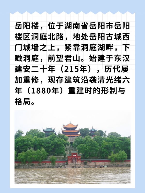 岳阳楼,位于湖南省岳阳市岳阳楼区洞庭北路,地处岳阳古城西门城墙之上,紧靠洞庭湖畔,下瞰洞庭,前望君山