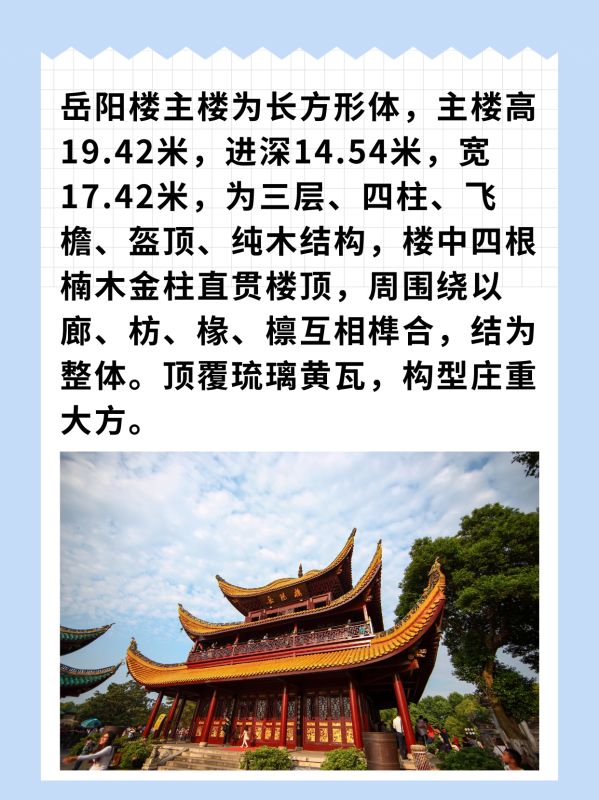 岳阳楼主楼为长方形体,主楼高19.42米,进深14.54米,宽17.42米,为三层、四柱、飞檐、盔顶、纯木结构,楼中四根楠木金柱直贯楼顶,周围绕以廊、枋、椽、檩互相榫合,结为整体。