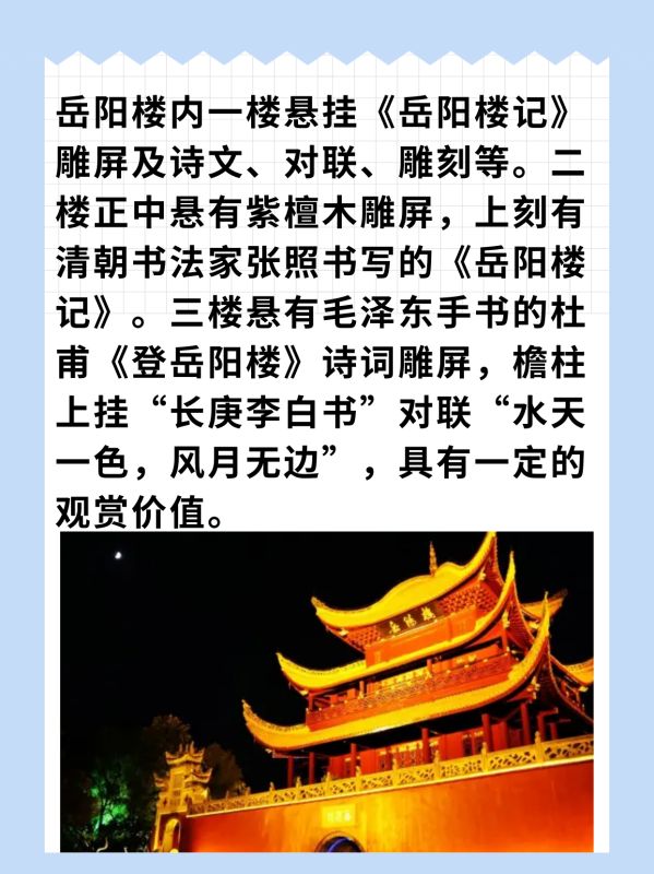 岳阳楼内一楼悬挂《岳阳楼记》雕屏及诗文、对联、雕刻等。二楼正中悬有紫檀木雕屏,上刻有清朝书法家张照书写的《岳阳楼记》。