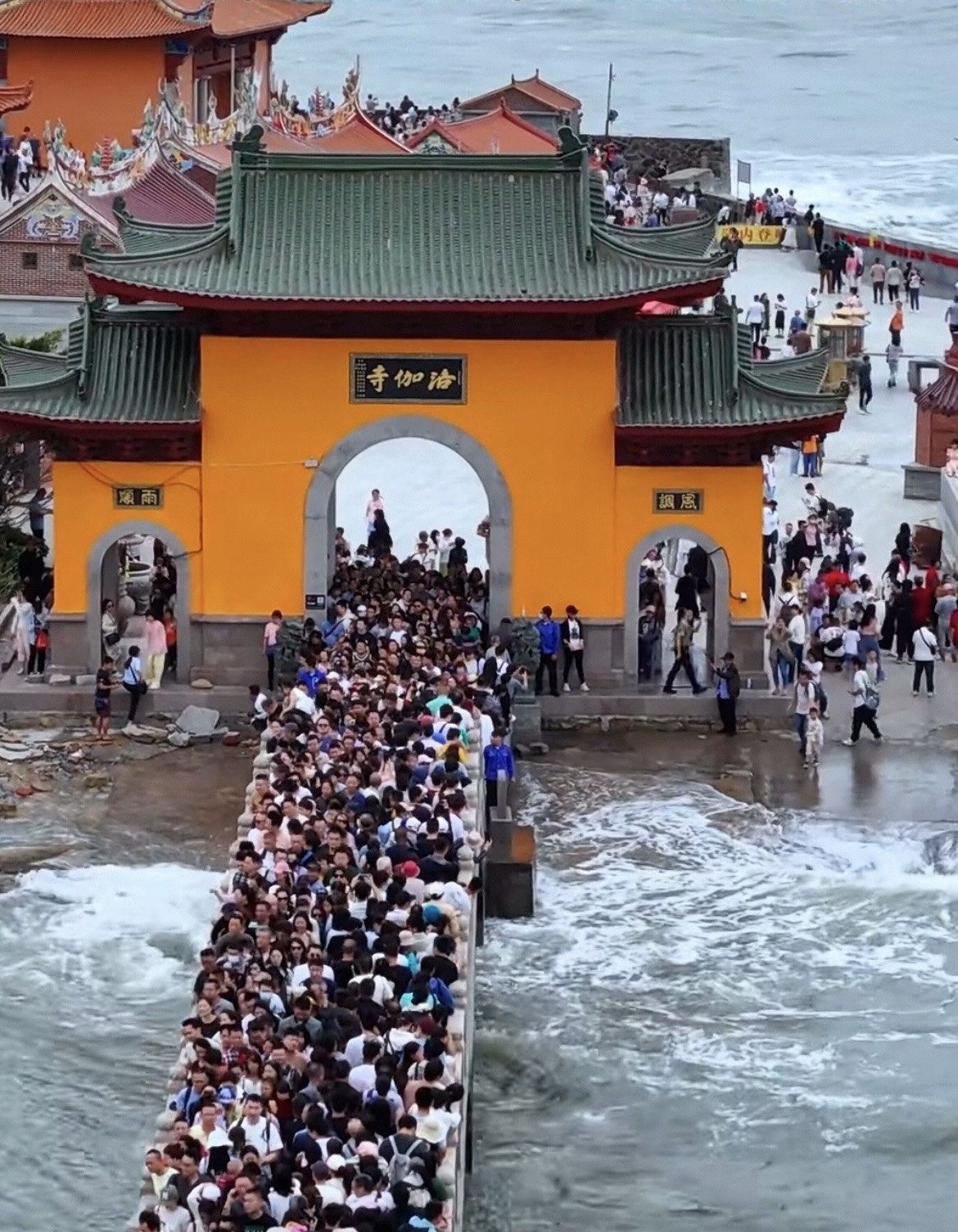1. **奇观体验** 国内罕见“一岛一寺”胜景!宫屿岛潮涨成孤岛,潮落通陆地,无人机俯瞰寺庙如蛟龙驮殿,随手拍都是《国家地理》级大片。