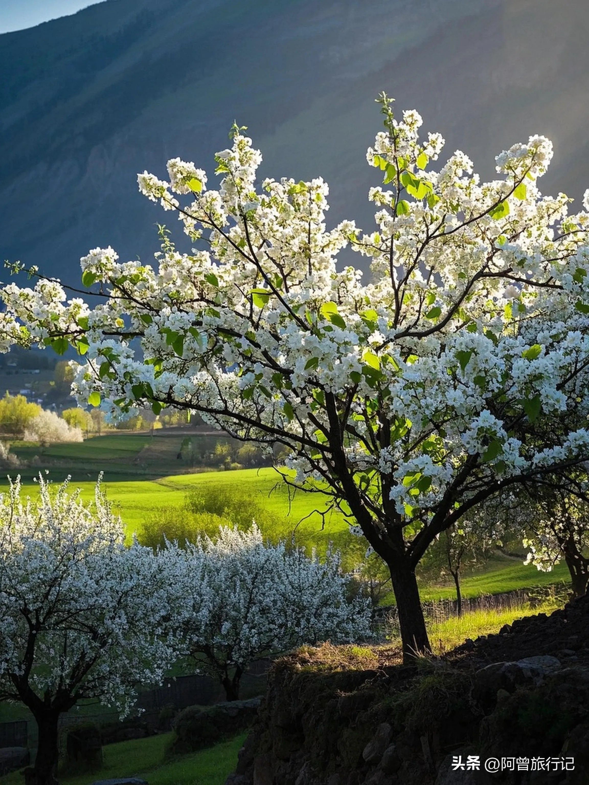 2. 赏花好去处:沙耳乡梨花密集,藏寨、碉楼点缀其中;咯尔乡梨花沿河谷分布,满是田园风光;庆宁乡的梨花与青稞田、雪山构成层次丰富的画面;勒乌镇位于县城,河畔梨花与水中倒影相映成趣。