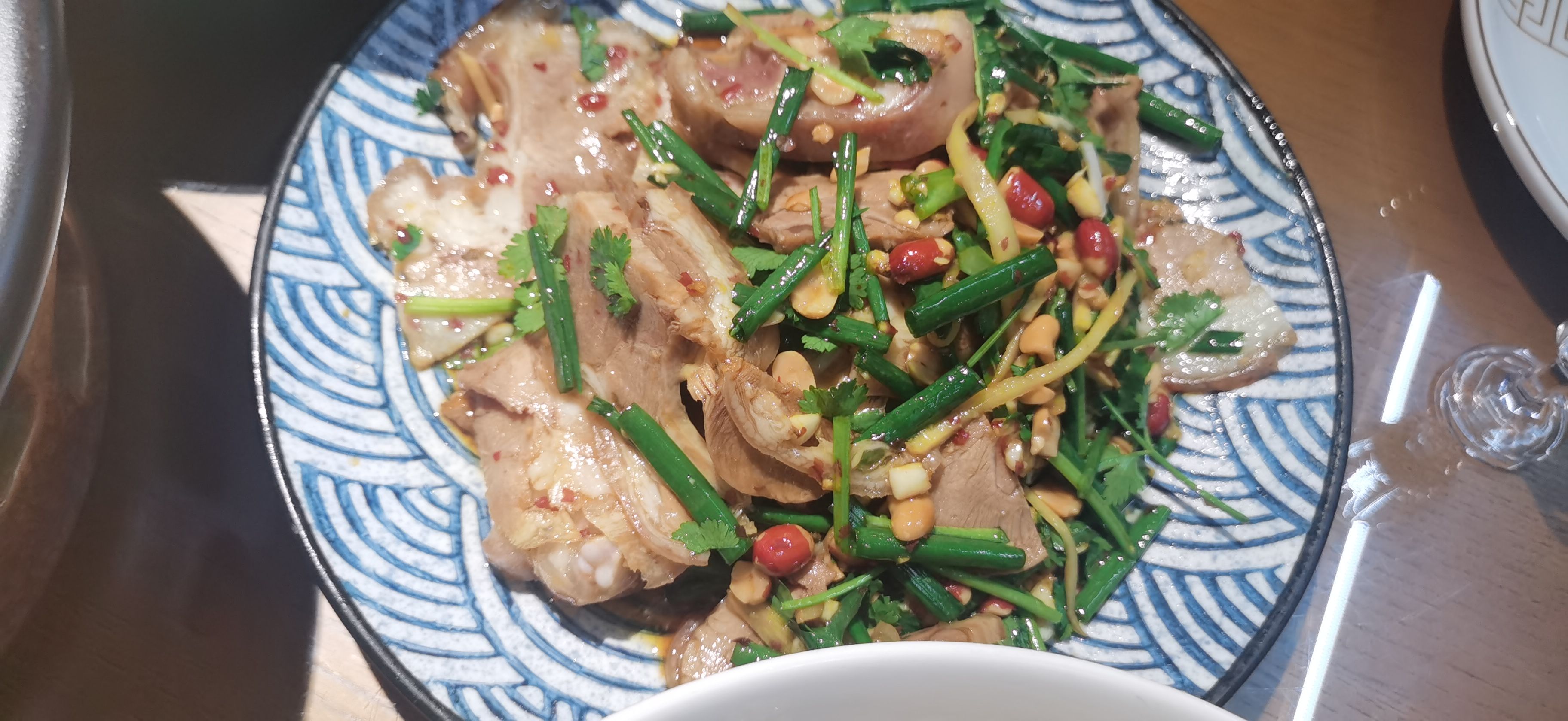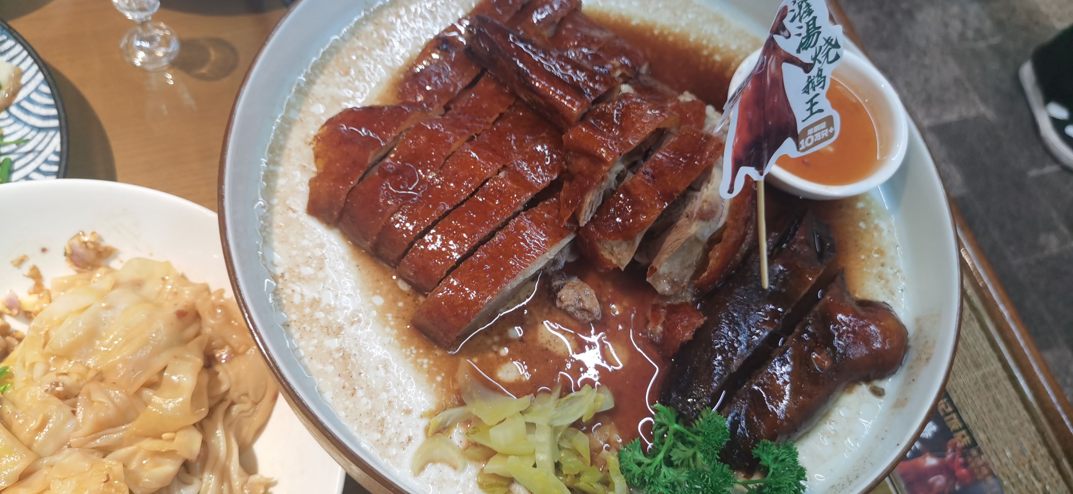 晚上我在酒店周边寻觅美食,发现了雷记饭店,招牌写着是适合家人朋友聚餐的地方。灌汤烧鹅是每桌必点的菜品,不到晚上6点30分,饭店就已座无虚席、人声嘈杂。我们三人点了五个菜,还买了一瓶山西汾酒,饱餐了一顿。